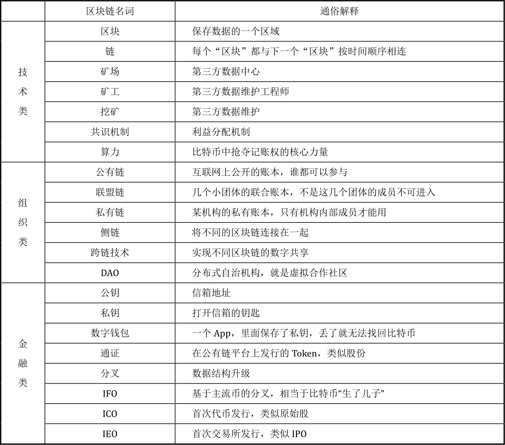 区块链技术起源于比特币,因此很多名词也来自比特币,如挖矿、数字货币、共识机制等。区块链技术中的很多名词非常奇怪,不容易从字面直接获得其内在含义,这也是很多人虽然看了很多区块链方面的文章和教材,但依然糊里糊涂的原因之一。其实,区块链的机制在我们日常生活中往往都可以找到对应的例子,本节用通俗的语言解释区块链名词。区块链名词的通俗解释如表1-3所示。