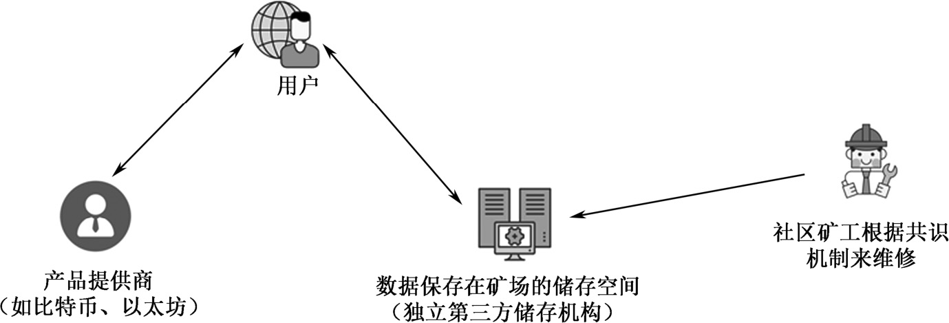 区块链分布式数据维护模式如图1-18所示,其核心是将这些保存数据的服务器放在第三方存储机构,这个存储机构是开放式的,任何人都可以加入或退出,这就保证了没有人可以控制这些数据中心,这也是区块链上的数据无法篡改的真正原因。因此,矿场其实就是第三方数据中心。