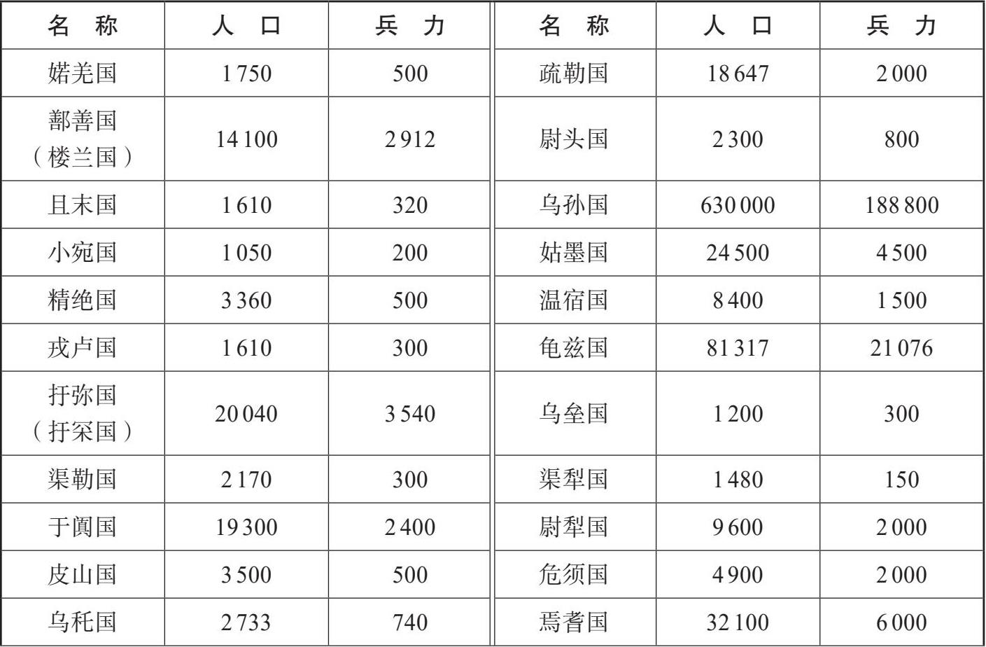 在西域,除了几个大国,其余大都是楼兰、车师这样的小国。它们虽然号称“西域三十六国”,但《汉书》一共记载了西域54个国家。这些国家大小相差巨大,除了几个大国,其余的人口甚至比不上一个村子。人口最少的只有194人(单桓),兵力最少的只有45人(单桓、狐胡)。可见,所谓的西域国家,有许多只是一个绿洲附近形成的居民点而已。它们与其说是一个国家,不如说只是一个城市或者一个村庄,只是幸运地占据了一片绿洲和草场,才被当作一个国家对待。