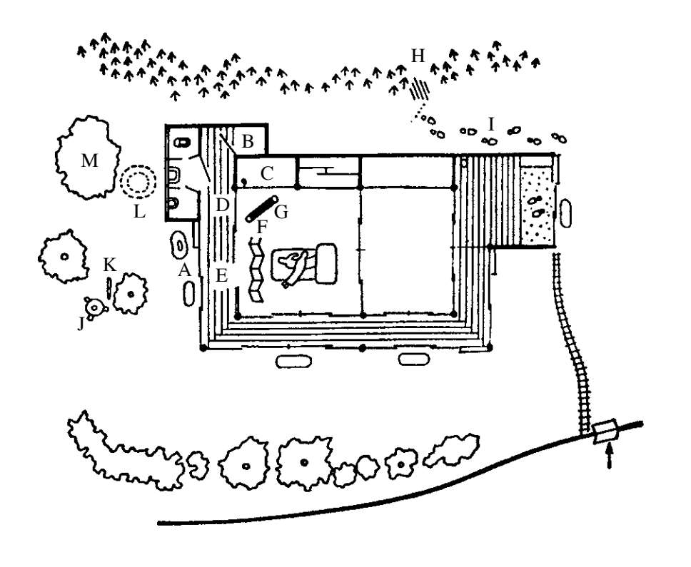 F对一柳家的妖琴杀人案很感兴趣,写了很详尽的笔记,现在还保存着。我现在写下的故事主要就是依照那份笔记。笔记里有一柳家偏院的示意图,对于说明这个故事极为重要,因此原封不动地展现给读者。