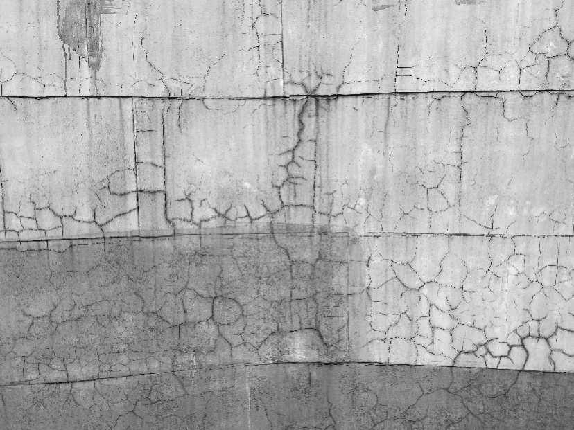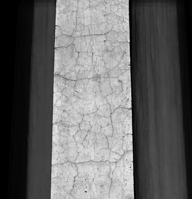 3)直缝与多边形网格。受钢筋影响的水平或垂直树杈形状,见图4-6中部。图4-9所示为北京某酒店美术馆墙柱裂缝,是受钢筋影响的水平缝与多边形网格缝的结合。