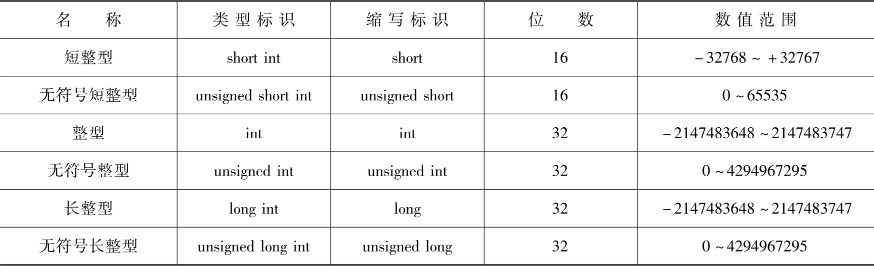 整型细分为长整型、整型、短整型,根据有无符号又划分为有符号长整型、无符号长整型、有符号整型、无符号整型、有符号短整型以及无符号短整型,如表3-2所示。