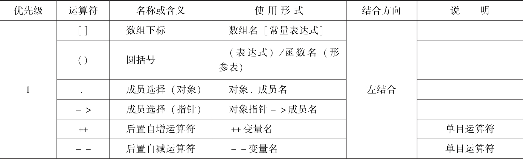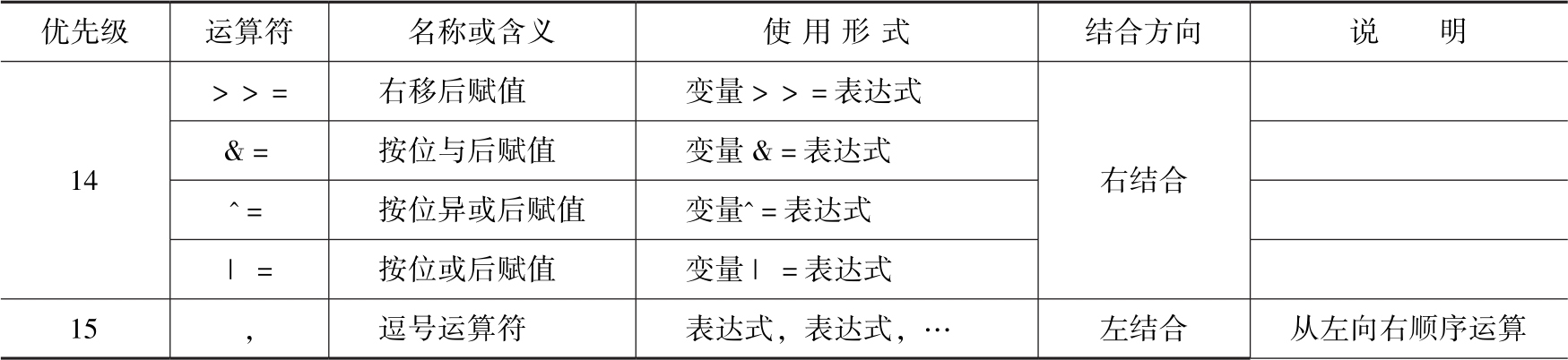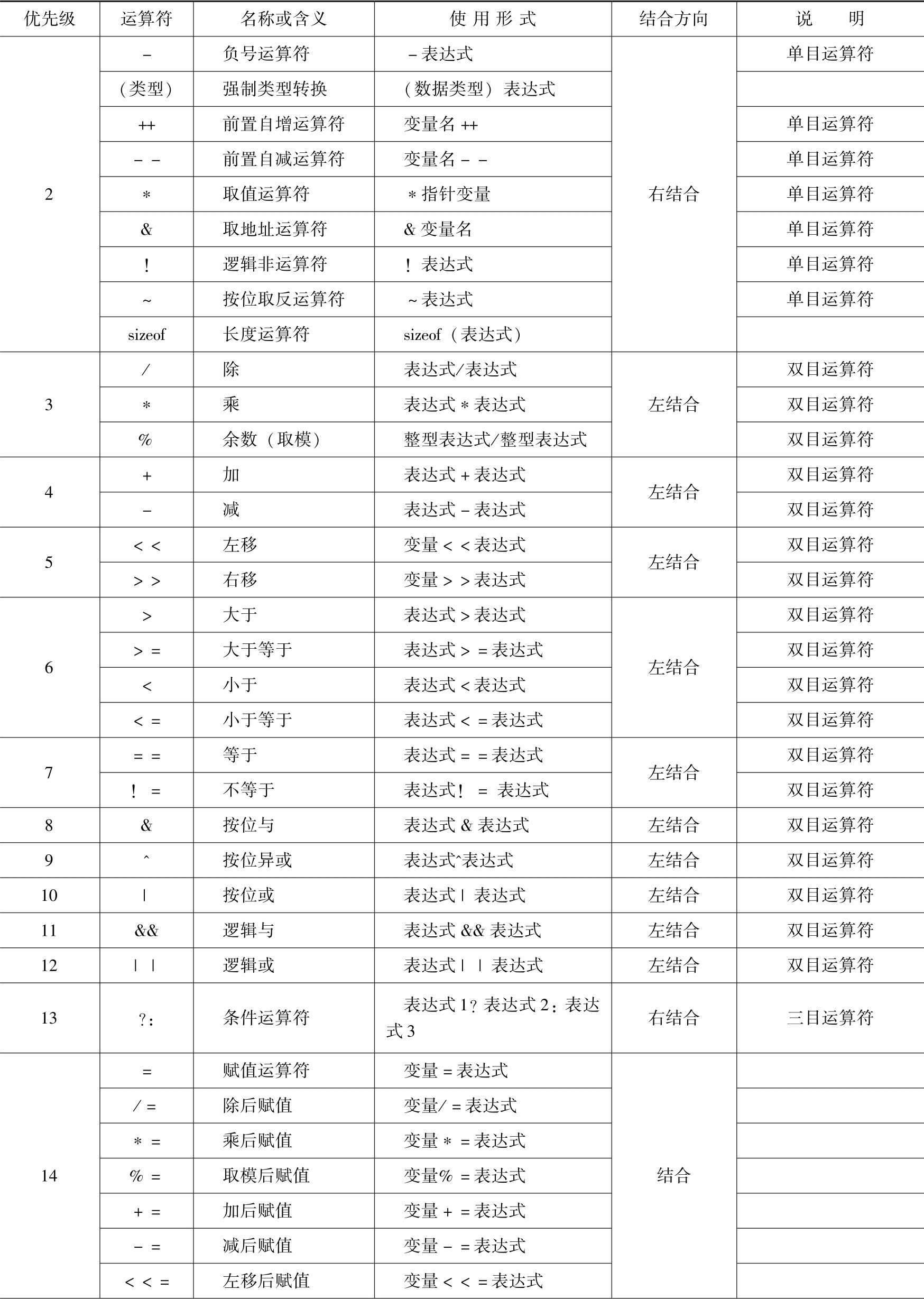 C语言将运算符的优先级划分为15个等级,为了便于理解运算符的优先级,又分为单目、双目和三目运算类型。单目就是只有一个对象(变量或者常量)参与运算,双目就是有两个对象,三目就是有三个对象。进一步描述运算过程,有左结合和右结合,它们的意思分别是运算过程从左向右执行和从右向左执行,如表3-4所示。