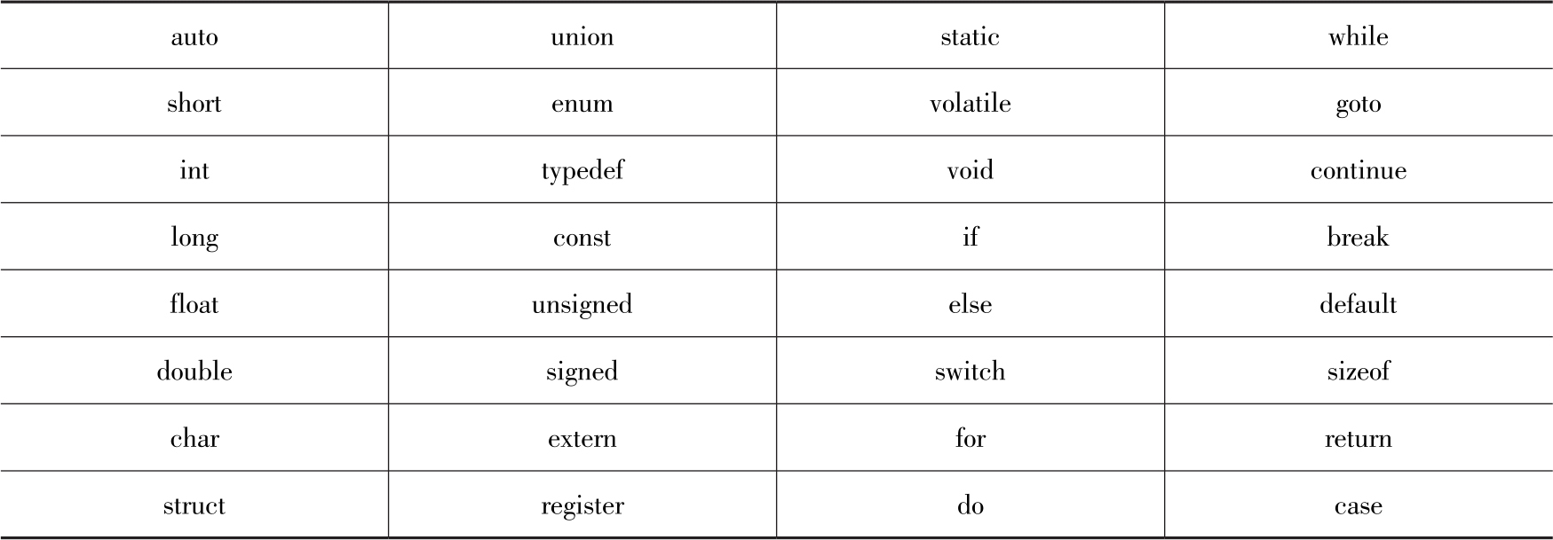 C语言标识符不能和关键字重名,因此有些关键字不能作为标识符来使用,如表3-1所示。