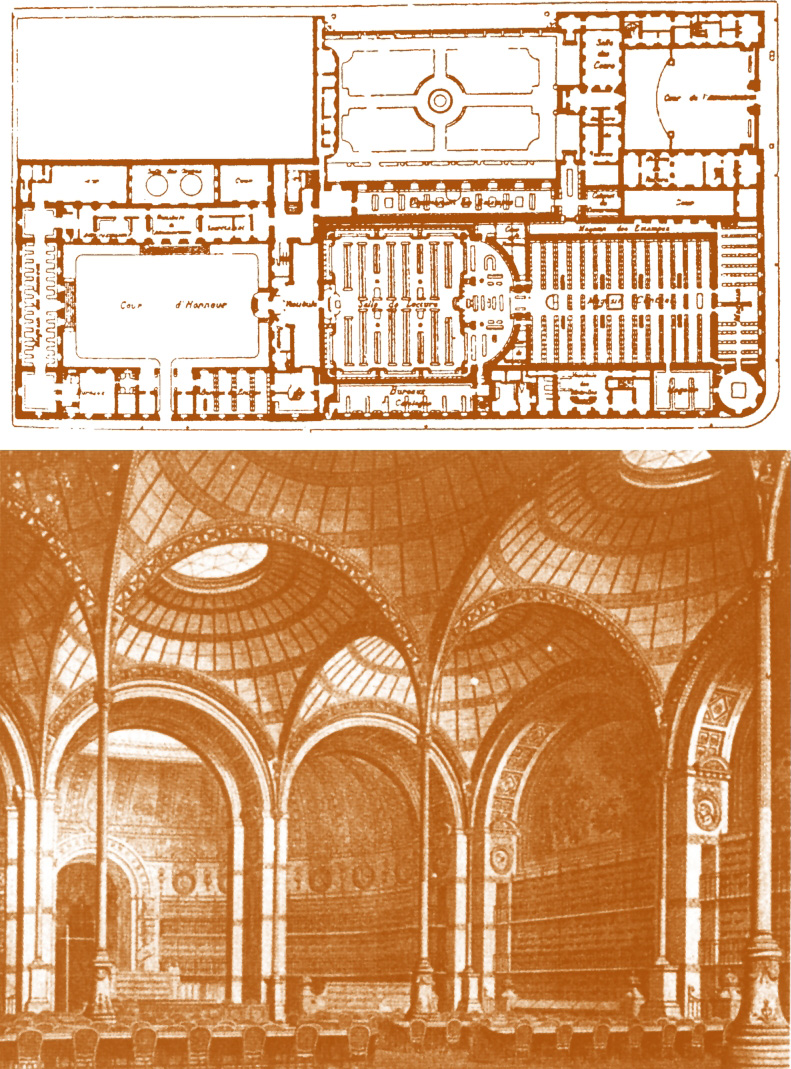 图4-9 巴黎国家图书馆平面及阅览厅铁拱顶,1858—1868年