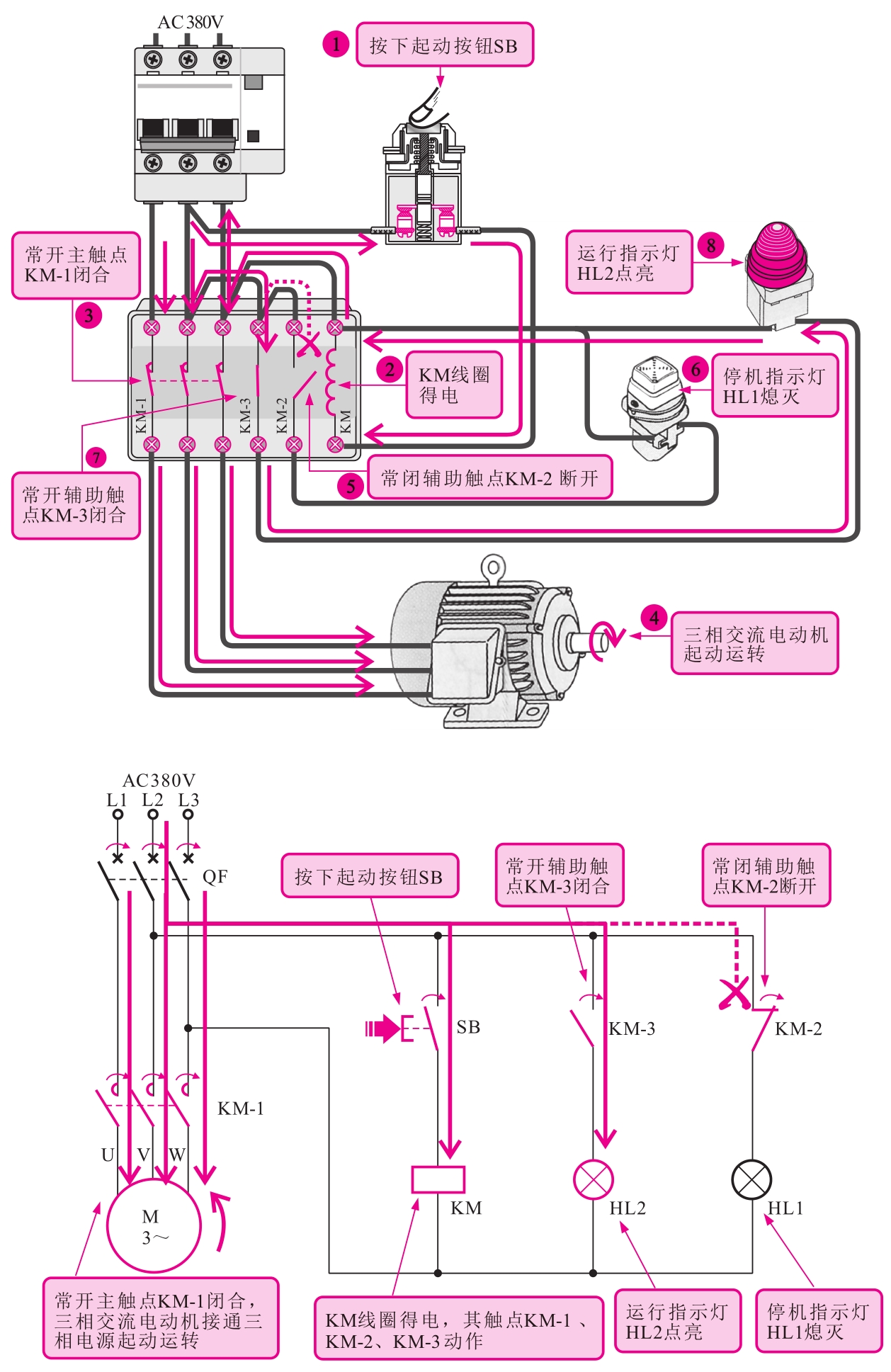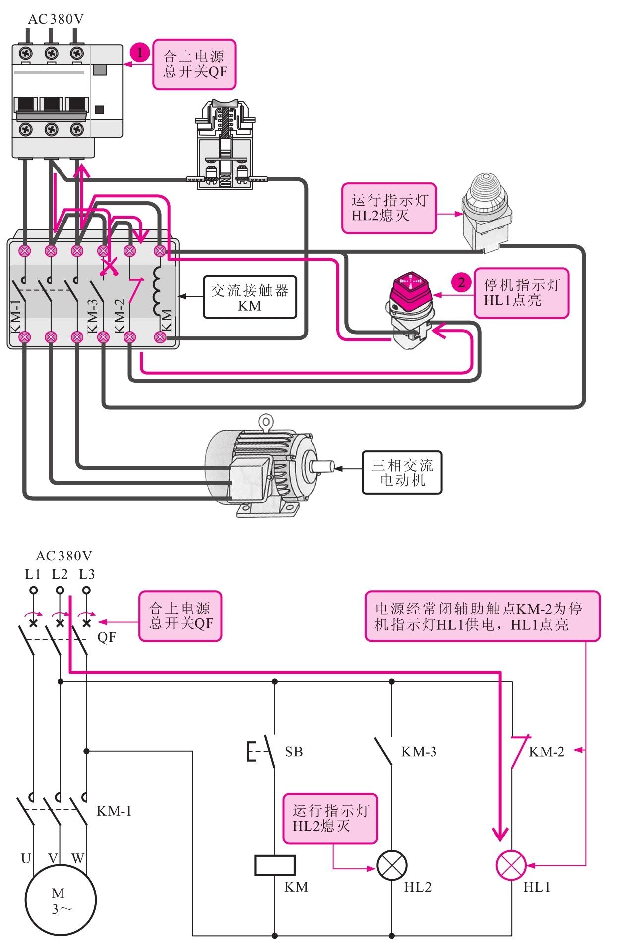 图2-16所示为电路接通时交流接触器的控制关系。当按下起动按钮SB时,电路接通,交流接触器KM线圈得电,常开主触点KM-1闭合,三相交流电动机接通三相电源起动运转;常开辅助触点KM-2断开,切断停机指示灯HL1的供电电源,HL1熄灭;常开主触点KM-3闭合,运行指示灯HL2点亮,指示三相交流电动机处于工作状态。松开起动按钮SB时,电路断开,交流接触器KM线圈失电,常开主触点KM-1复位断开,切断三相交流电动机的供电电源,电动机停止运转;常开辅助触点KM-2复位闭合,停机指示灯HL1点亮,指示三相交流电动机处于停机状态;常开主触点KM-3复位断开,切断运行指示灯HL2的供电电源,HL2熄灭。