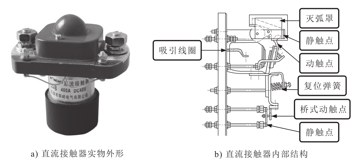 直流接触器是一种用于远距离接通与分断直流供电电路的器件,主要由灭弧罩、静触点、动触点、吸引线圈、复位弹簧等部分组成,如图2-17所示。