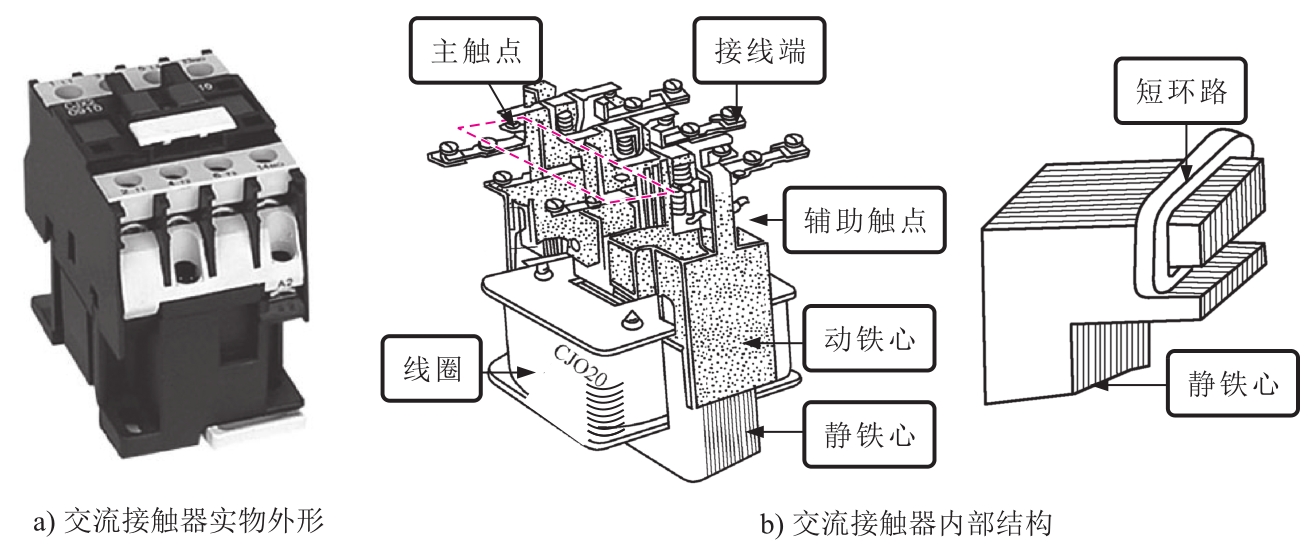 交流接触器主要用于远距离接通与分断交流供电电路,如图2-14所示。交流接触器的内部主要由主触点、辅助触点、线圈、静铁心、动铁心及接线端等构成,在交流接触器的铁心上装有一个短路环,主要用于减小交流接触器吸合时所产生的振动和噪声。