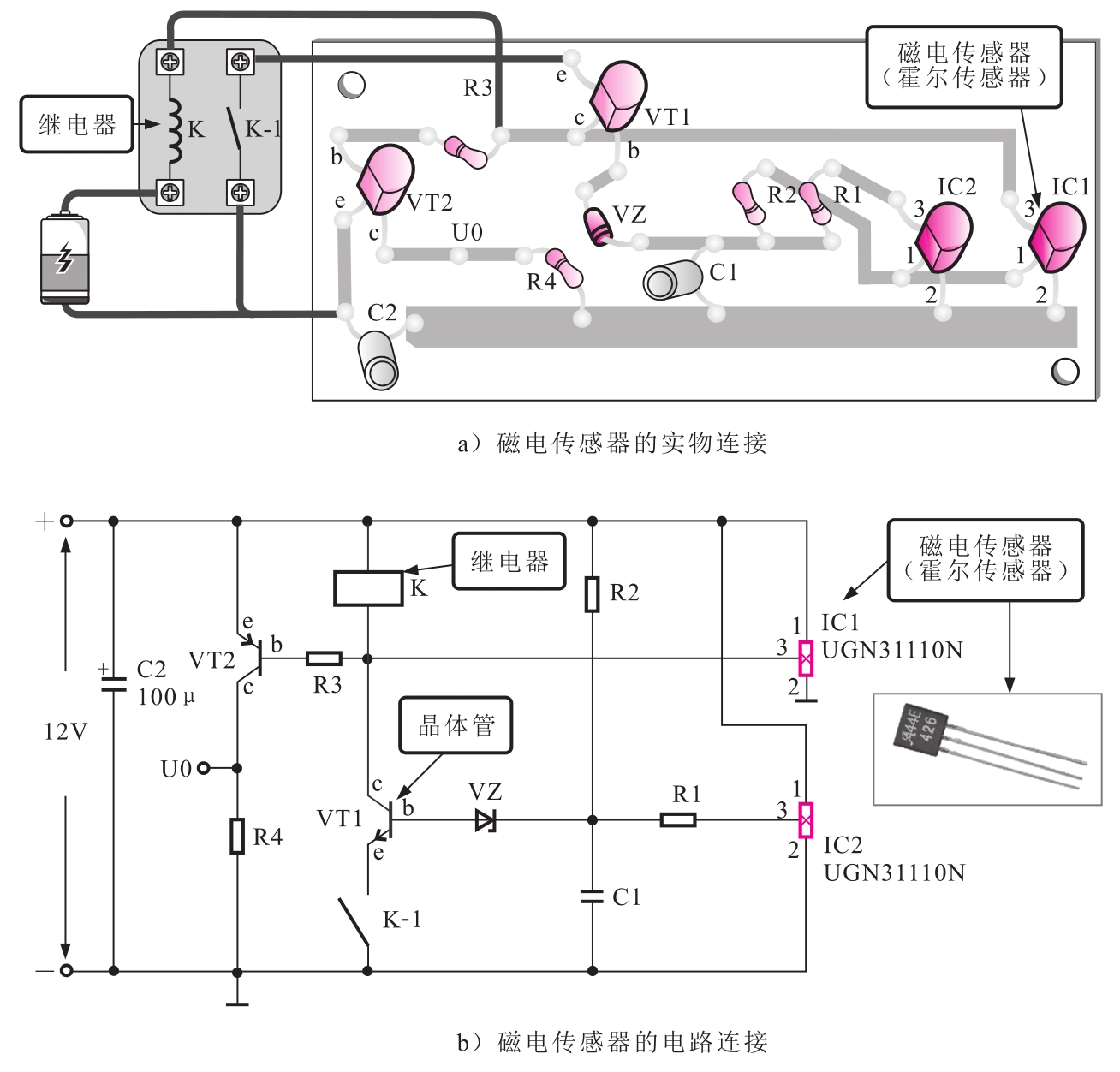 图3-15所示为磁电传感器的连接关系。从图中可以看出,该磁电传感器采用的是霍尔传感器作为磁场测控器件。霍尔传感器是一种特殊的半导体器件,能够直接感知外界变化的磁场,并将其转换为电信号。