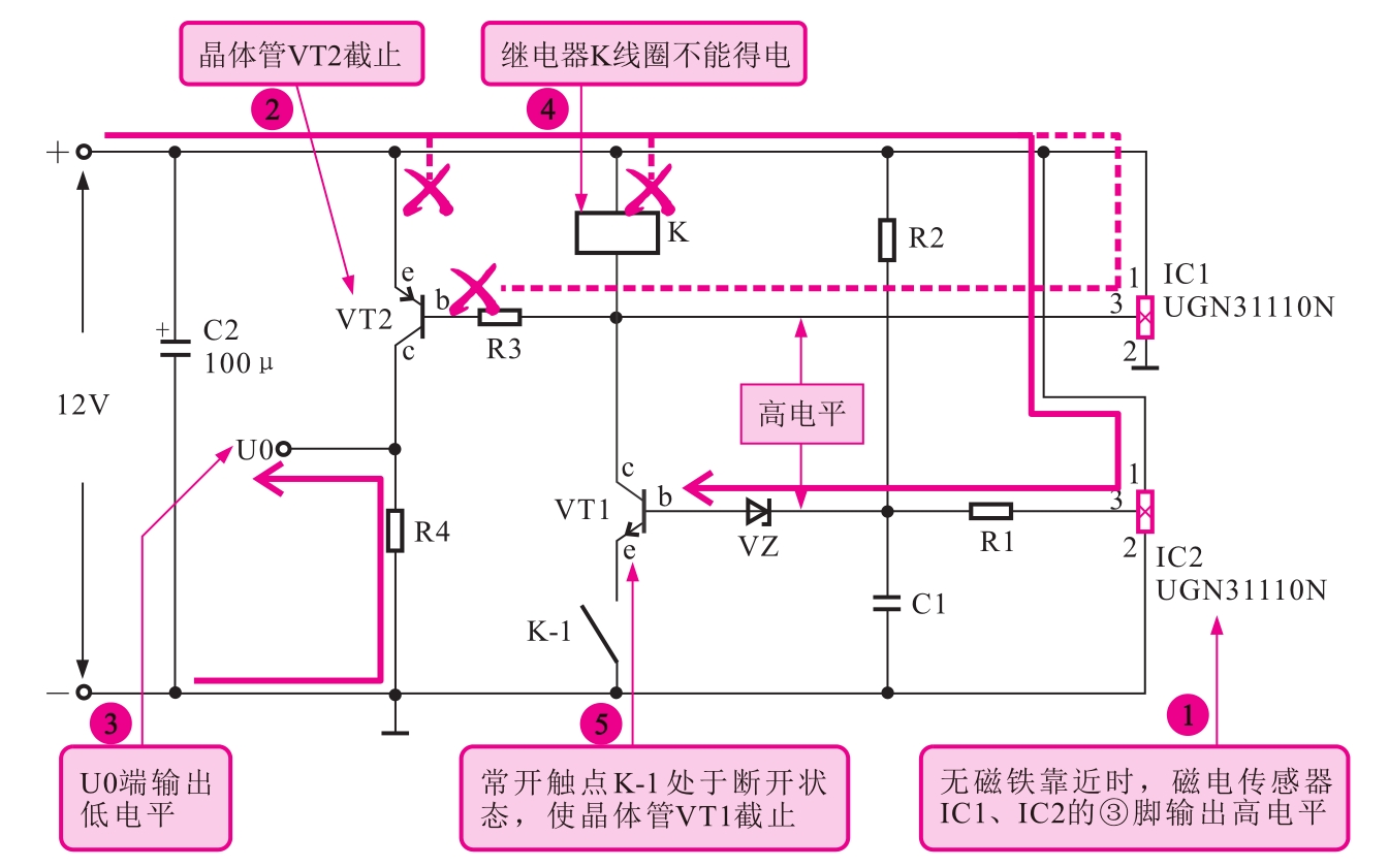 图3-16所示为无磁铁靠近时磁电传感器的控制关系。无磁铁靠近时,磁电传感器IC1、IC2的③脚输出高电平,继电器K线圈不能得电,常开触点K-1处于断开状态,使晶体管VT1截止;同时晶体管VT2也截止,U0端输出低电平。