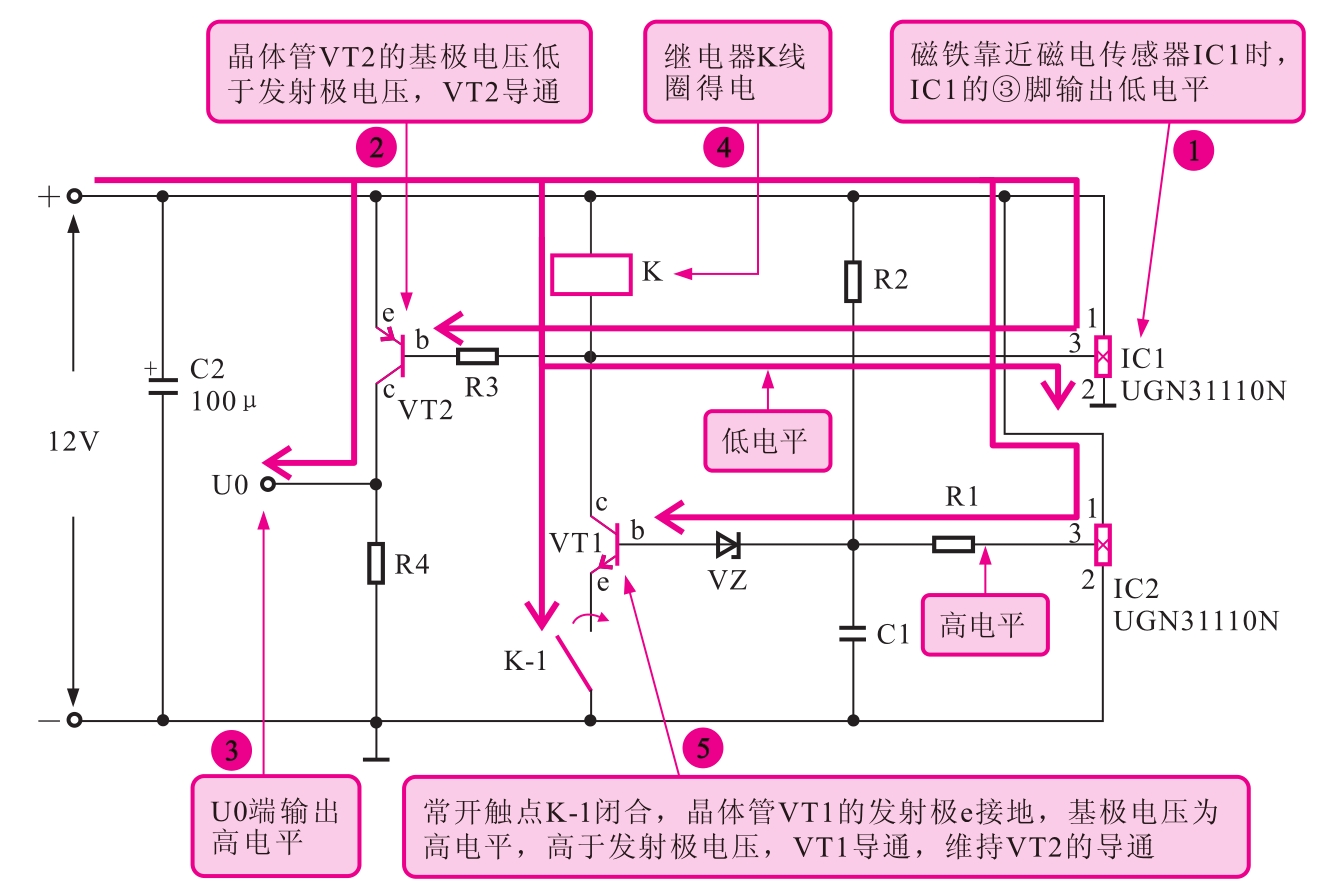 当磁铁离开磁电传感器IC1靠近IC2时,磁电传感器IC1的③脚输出高电平,IC2的③脚输出低电平,稳压二极管将VT1基极钳位在低电平,进而使晶体管VT1截止,继电器K线圈失电,常开触点K-1复位断开。此时晶体管VT2的基极变为高电平,VT2截止,U0端输出低电平。