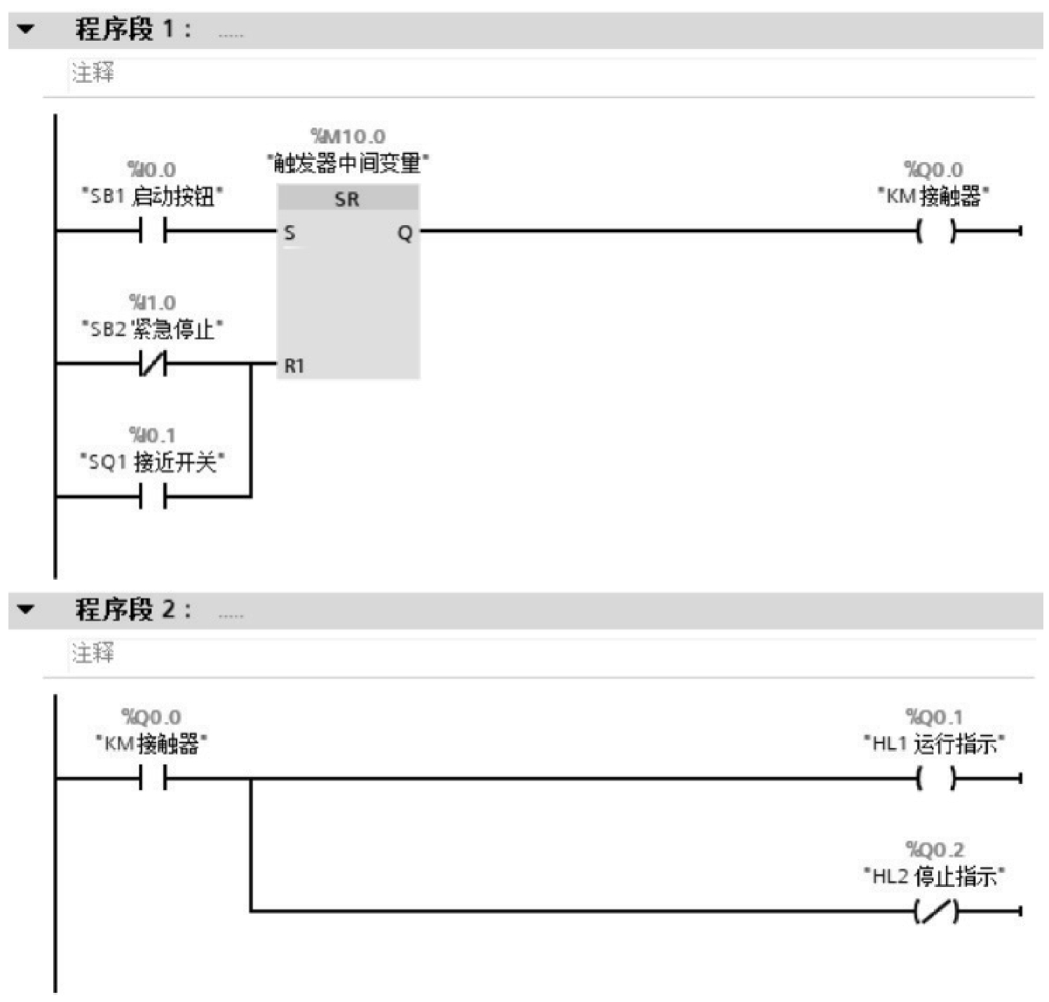 输送带控制跟【实例2-1】一样,不同的是要用启动按钮SB1和急停按钮SB2,用SR触发器进行编程控制。
