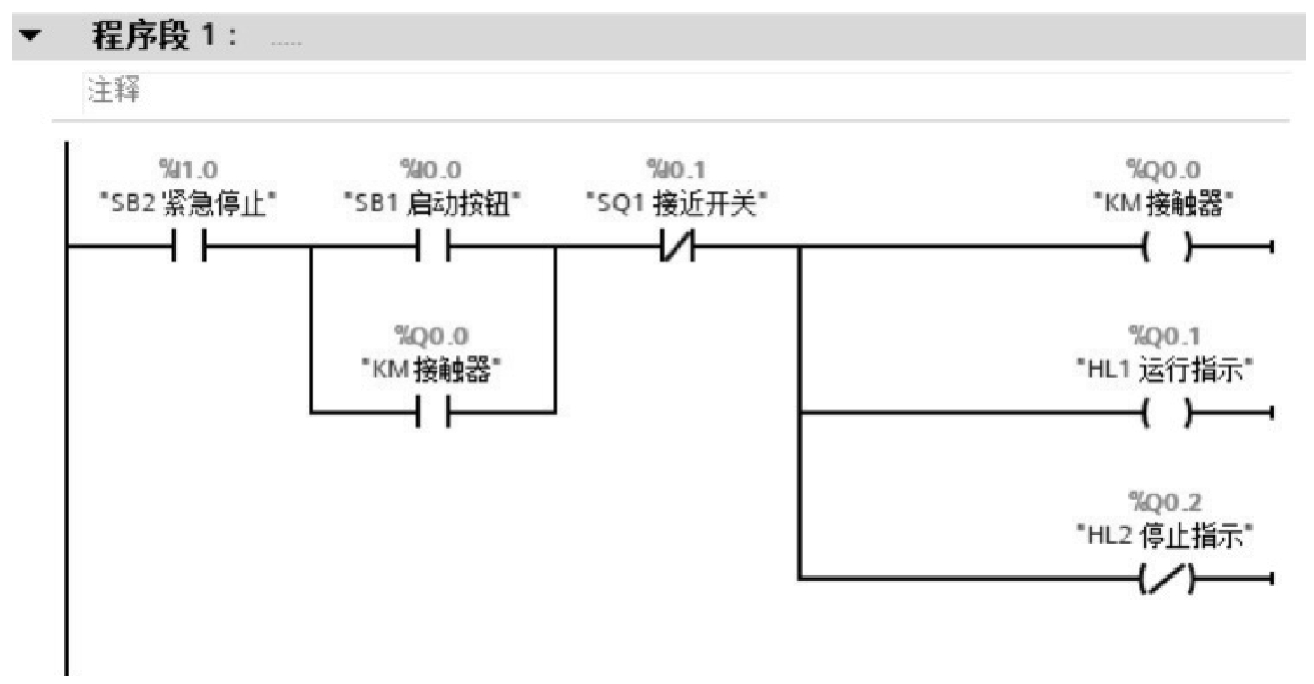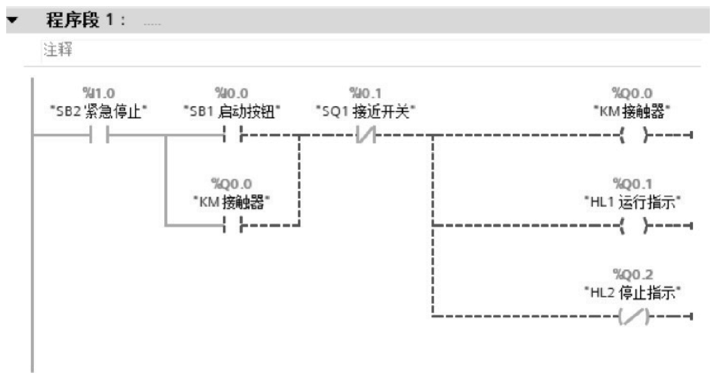 PLC的梯形图编程方法可以采用传统的“继电器-接触器”思路,如本实例中的“自锁控制”方法,当按下按钮I0.0后,Q0.0线圈闭合;此时Q0.0的触点动作,持续接通Q0.0线圈,形成自锁控制。当I1.0紧急停止动作或I0.1接近开关动作,Q0.0线圈断开,自锁失效。在编程中,还需要注意Q0.2输出和Q0.1刚好相反,可以采用取反线圈