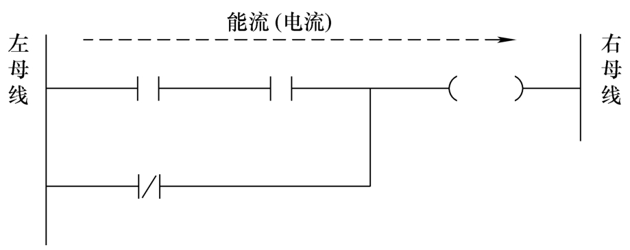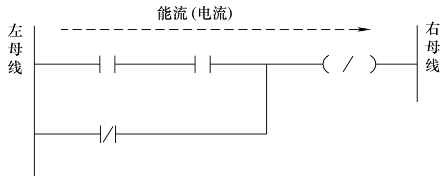 )改变能流输入的状态,将RLO的当前值由0变1,或由1变0。如图2-1中,左右母线是一个直流电源的正负极,左母线是接正极,右母线接负极,能流(电流)沿着梯形图,从左母线流到右母线,形成一条回路。如果采用