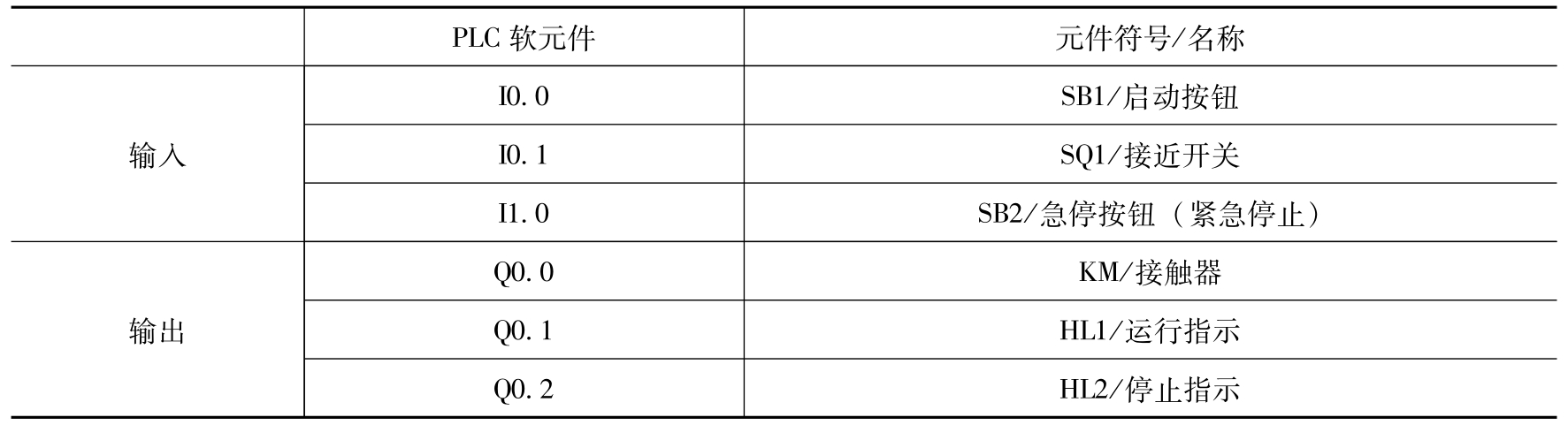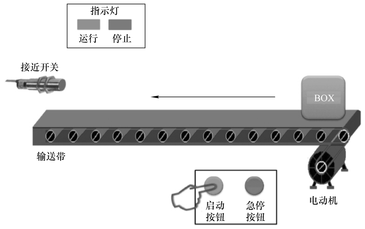 输送带起停控制涉及按钮、接近开关、电动机和指示灯等元件,表2-2所示为本实例的输入/输出元件及控制功能。