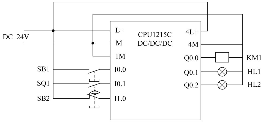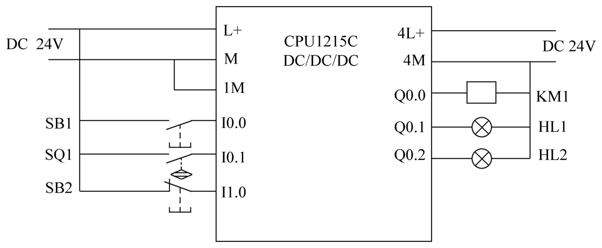 本实例采用S7-1200 PLC中的CPU1215C DC/DC/DC,具体接线图如图2-5所示。为了更加直观地反映输入/输出情况,将电源部分略作修改后的接线图如图2-6所示(本书后续实例主要采用这种画法)。
