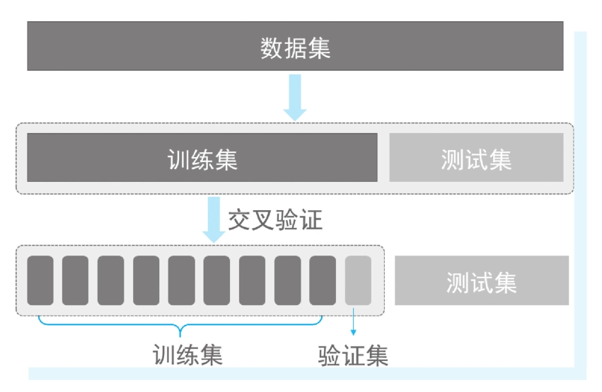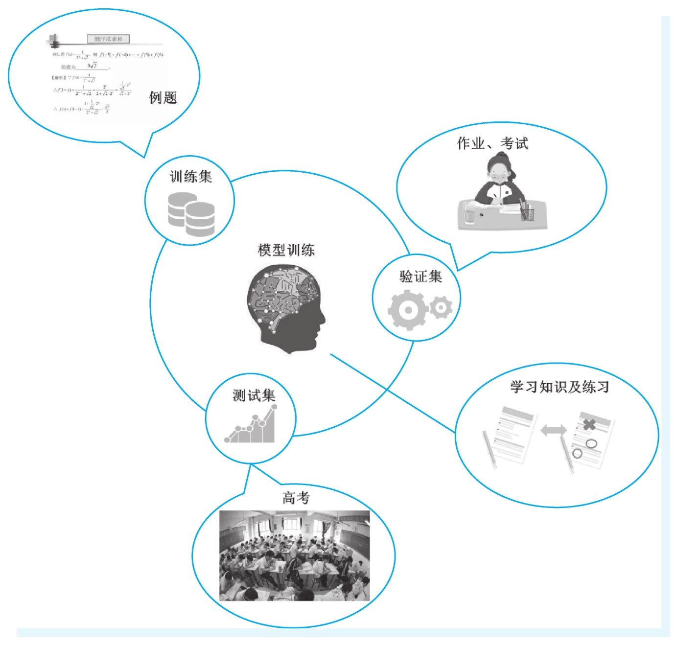 如图1-3所示,对训练集、测试集、验证集可以有如下的理解:学生课本中的例题即训练集;老师布置的作业、月考等都可以算作是验证集;高考为测试集。学生上课过程中所学习到的知识以及课上做的练习题就是模型训练的过程。