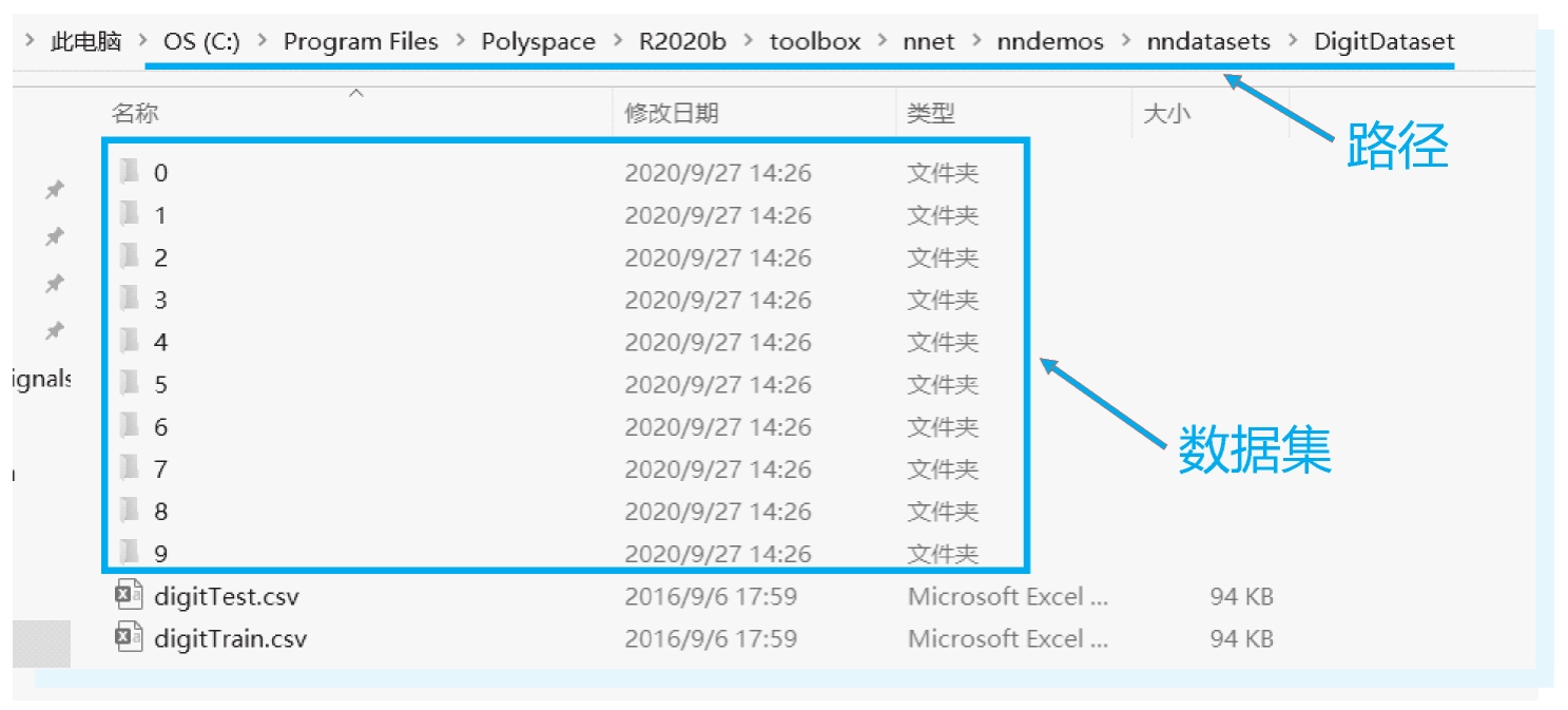 在安装MATLAB之后,该数据集会被自动加载,其所在的路径如图1-4所示(MATLAB的版本不同,安装的路径不同,mnist数据集所在的路径也会有所不同,请读者以计算机上安装后的实际路径为准)。