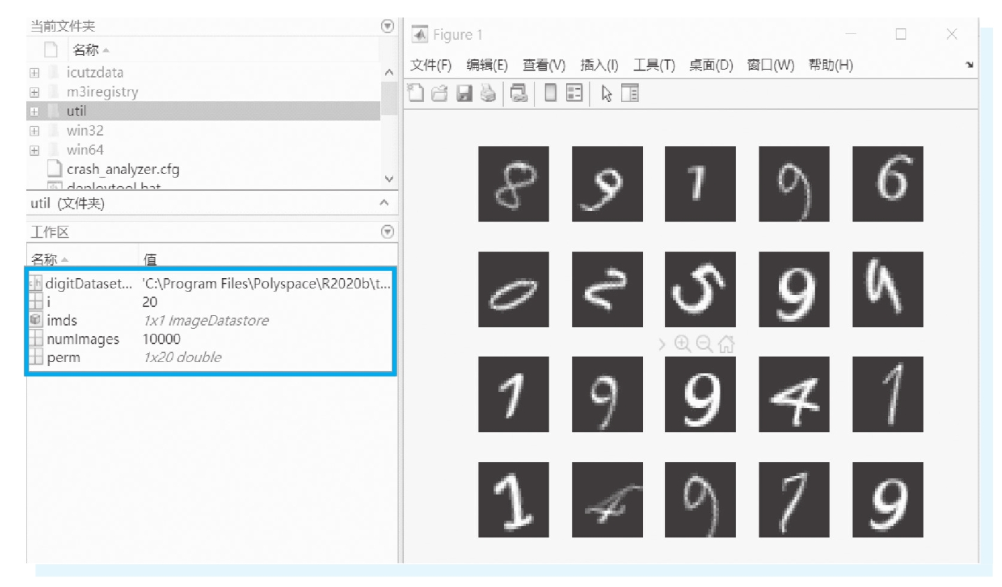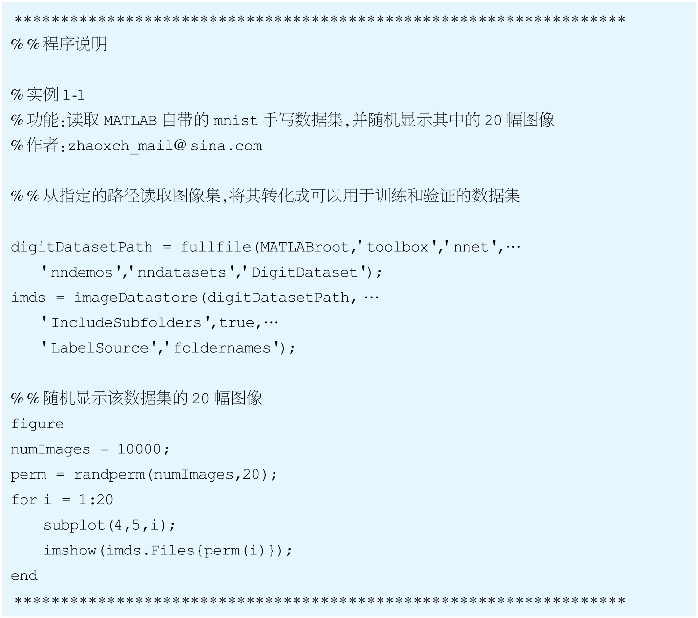 读取MATLAB自带的mnist手写数据集,并随机显示其中的20幅图像。请读者结合上述的讲解对程序进行理解。例程1-1的运行效果如图1-5所示。