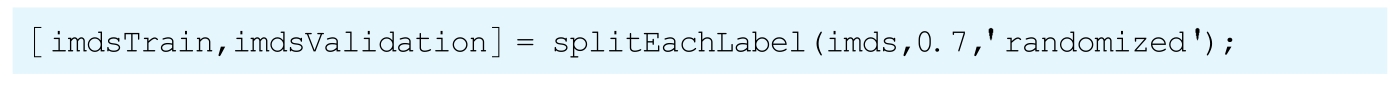 例如, [imdsTrain,imdsValidation] = splitEachLabel(imds,750,'randomize')。