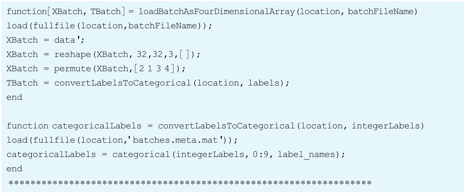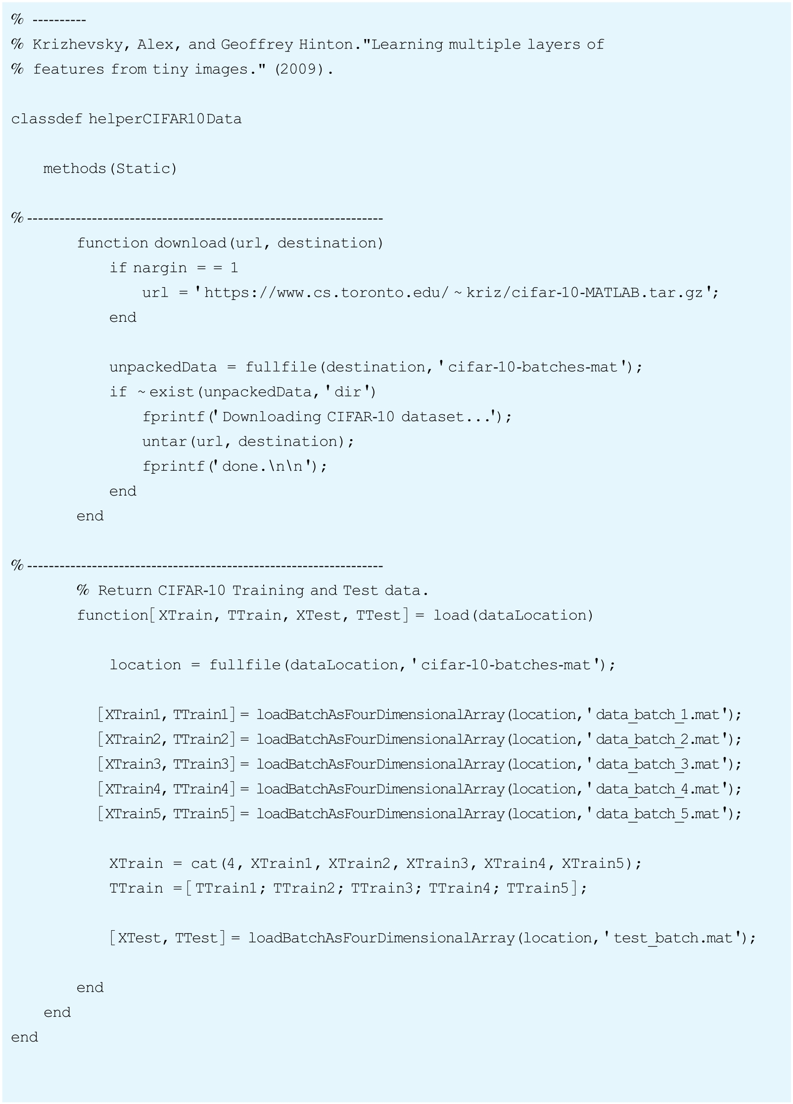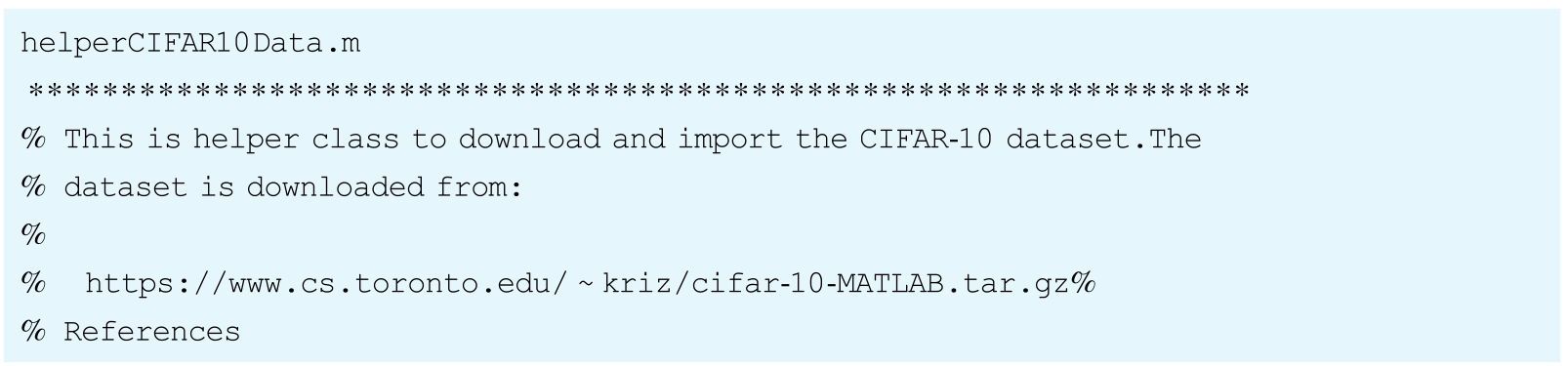 步骤3: 新建一个名为helperCIFAR10 Data.m的文件,将如下代码输入,并保存,该代码的功能是将CIFAR-10数据集下载并导入,在本节中不作详细讲解。