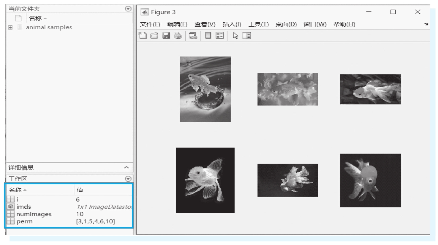 在本书的随书附赠网盘资料中,有一个简单的图像集(名为animal samples的文件夹,该文件夹下有一个子文件夹,文件夹名分别为goldfish,文件夹下有10张图片,如图1-6所示),将该图像集导入MATLAB的工作区中,其步骤如下。
