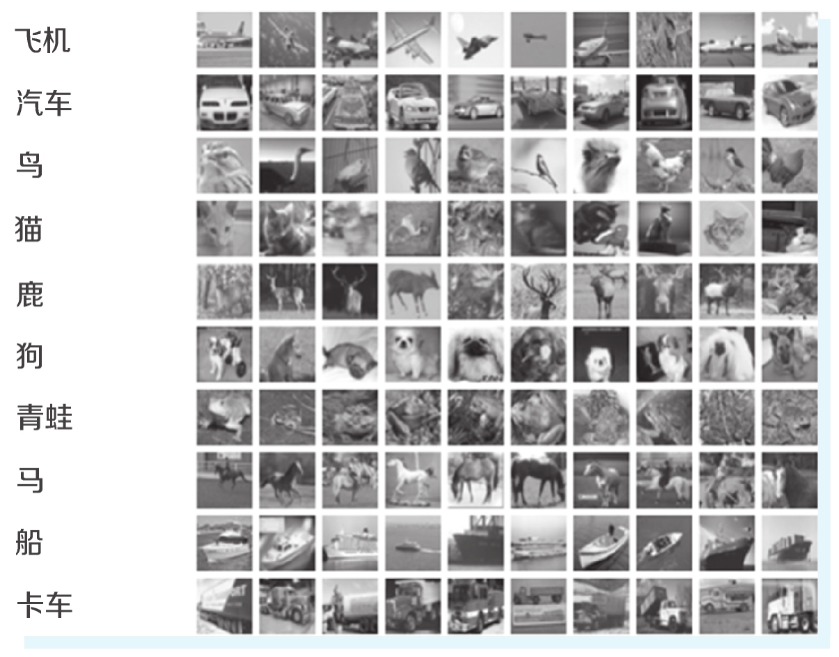 CIFAR-10数据集由10个类(飞机、汽车、鸟、猫、鹿、狗、青蛙、马、船、卡车)的60000个32×32彩色图像组成,每个类有6000个图像。有50000个训练图像和10000个测试图像。CIFAR-10数据集及其分类示意图如图1-8所示。