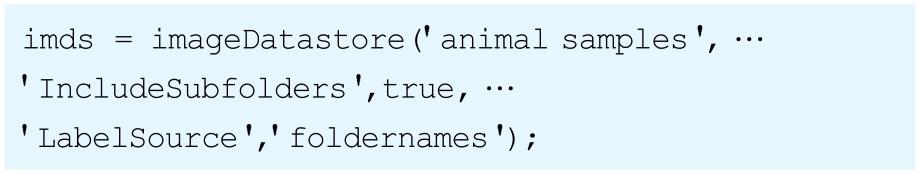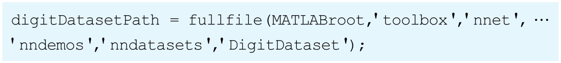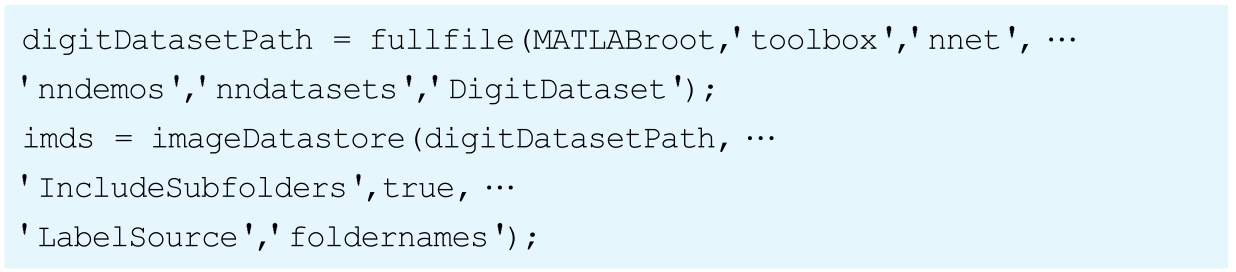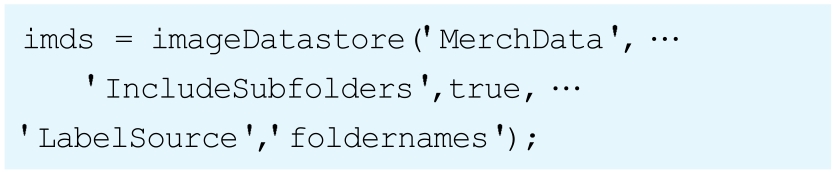 上述语句实现的功能为,将存储在C盘的\ Documents\ MATLAB\ MerchData文件夹下的图像集转化为可用的训练及验证数据集。