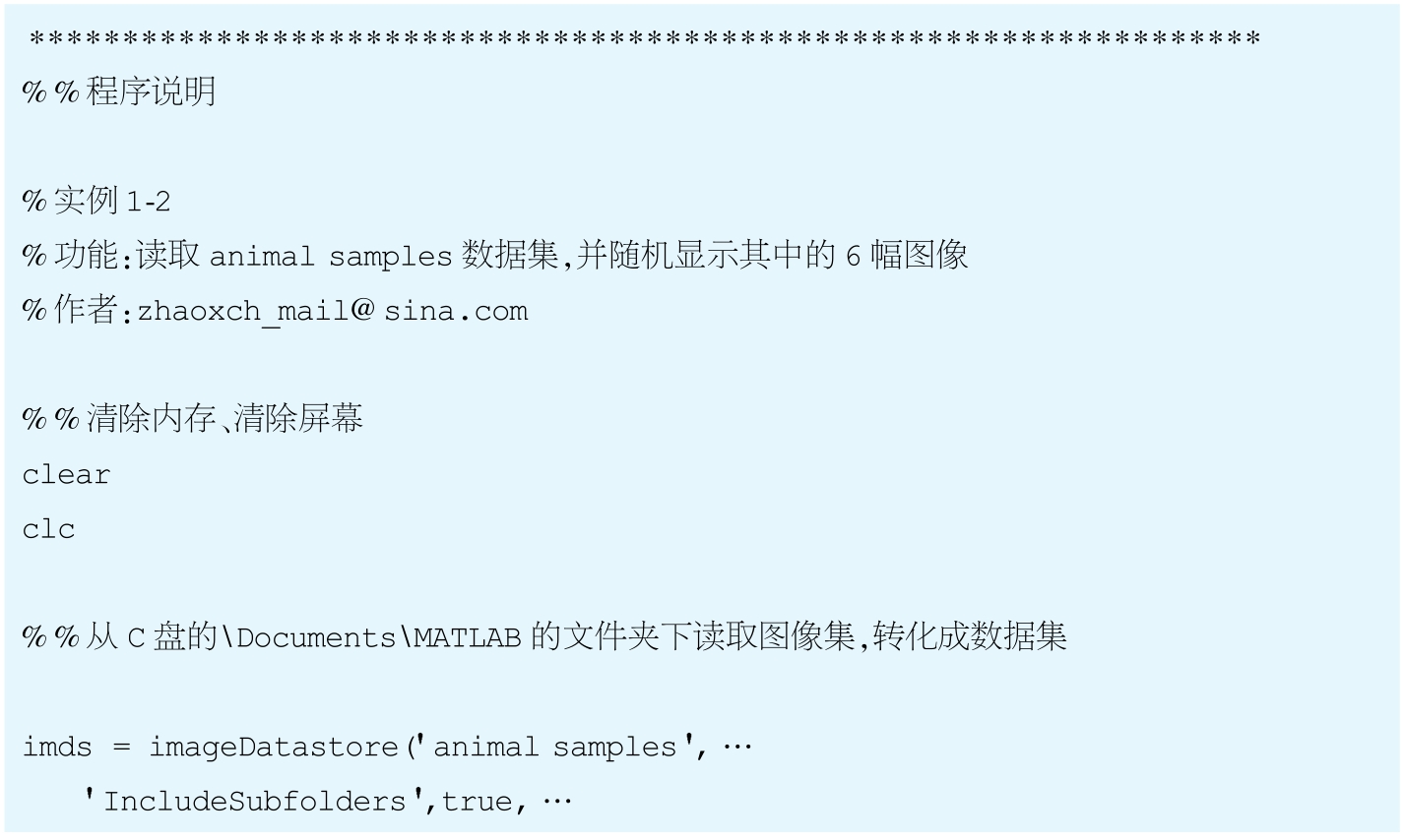读取animal samples数据集(已将其放到C盘的\ Documents\ MATLAB的文件夹中),并随机显示其中的6幅图像。请读者结合上述的讲解对程序进行理解。例程1-2的运行效果如图1-7所示。