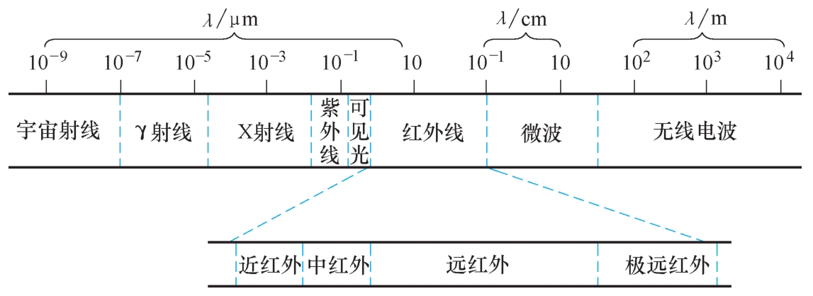 红外线传感器是利用物体产生红外辐射的特性,实现自动检测的传感器。在物理学中,我们已经知道可见光、不可见光、红外光及无线电等都是电磁波,它们之间的差别只是波长不同而已。下面是将各种电磁波按照波长(或频率)排成如图2-44所示的波谱图,称为电磁波谱。