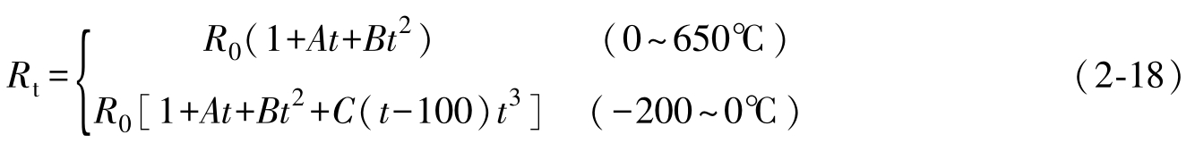 式中, R t 为温度为 t 时的电阻值; R 0 为温度为0℃时的电阻值; A 为常数, A =3.96847×10 -3 ; B 为常数, B =5.847×10 -7 ; C 为常数, C =-4.22×10 -12 。