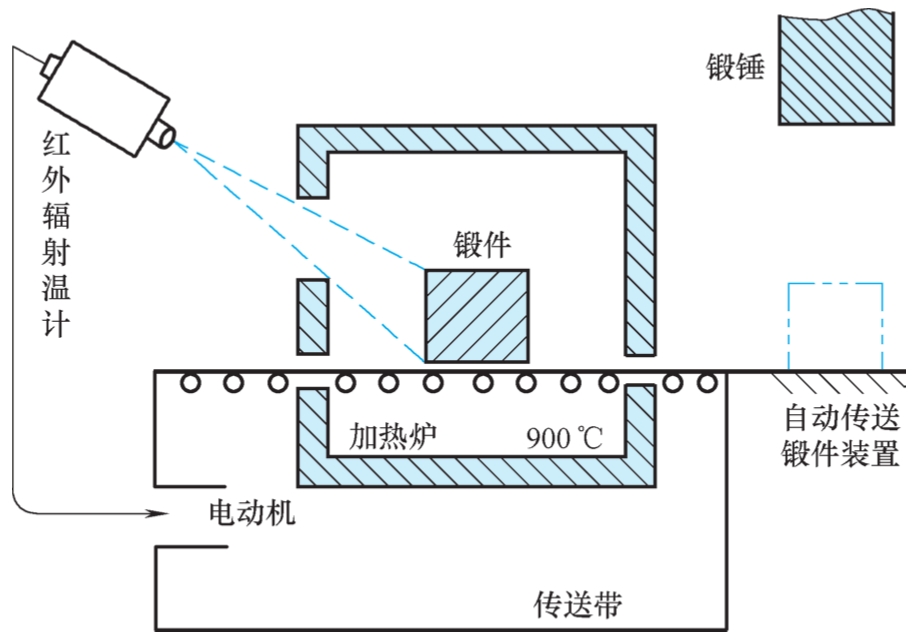 在锻造厂里,工件在锻造之前需要在加热炉内加热到900℃,其误差不得超过±5℃,否则会影响锻件的质量,所以控制锻件的温度是个关键问题,采用红外辐射测温计,通过加热炉口可以直接对准工件的表面,从而测量出工件的温度,如图2-45所示。当锻件加热到900℃时,红外探测器便输出电信号,起动电动机将锻件从加热炉中由传送带送到锻锤之下进行锻压加工。这样利用红外探测器就可对整个工作过程实现自动控制。