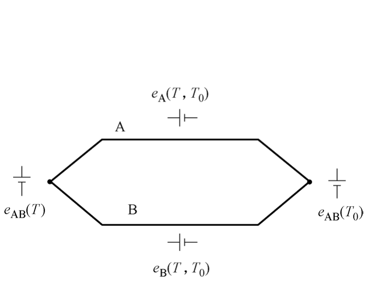 有两种不同的导体或半导体A和B组成一个回路,其两端相互连接(见图2-42),且两接点处的温度不同,一端温度为 T ,称为工作端或热端,另一端温度为 T 0 ,称为自由端(也称参考端)或冷端,回路中将产生一个电动势,该电动势的方向和大小与导体的材料及两接点的温度有关。这种现象称为热电效应,两种导体组成的回路称为热电偶,这两种导体称为热电极,产生的电动势则称为热电动势。