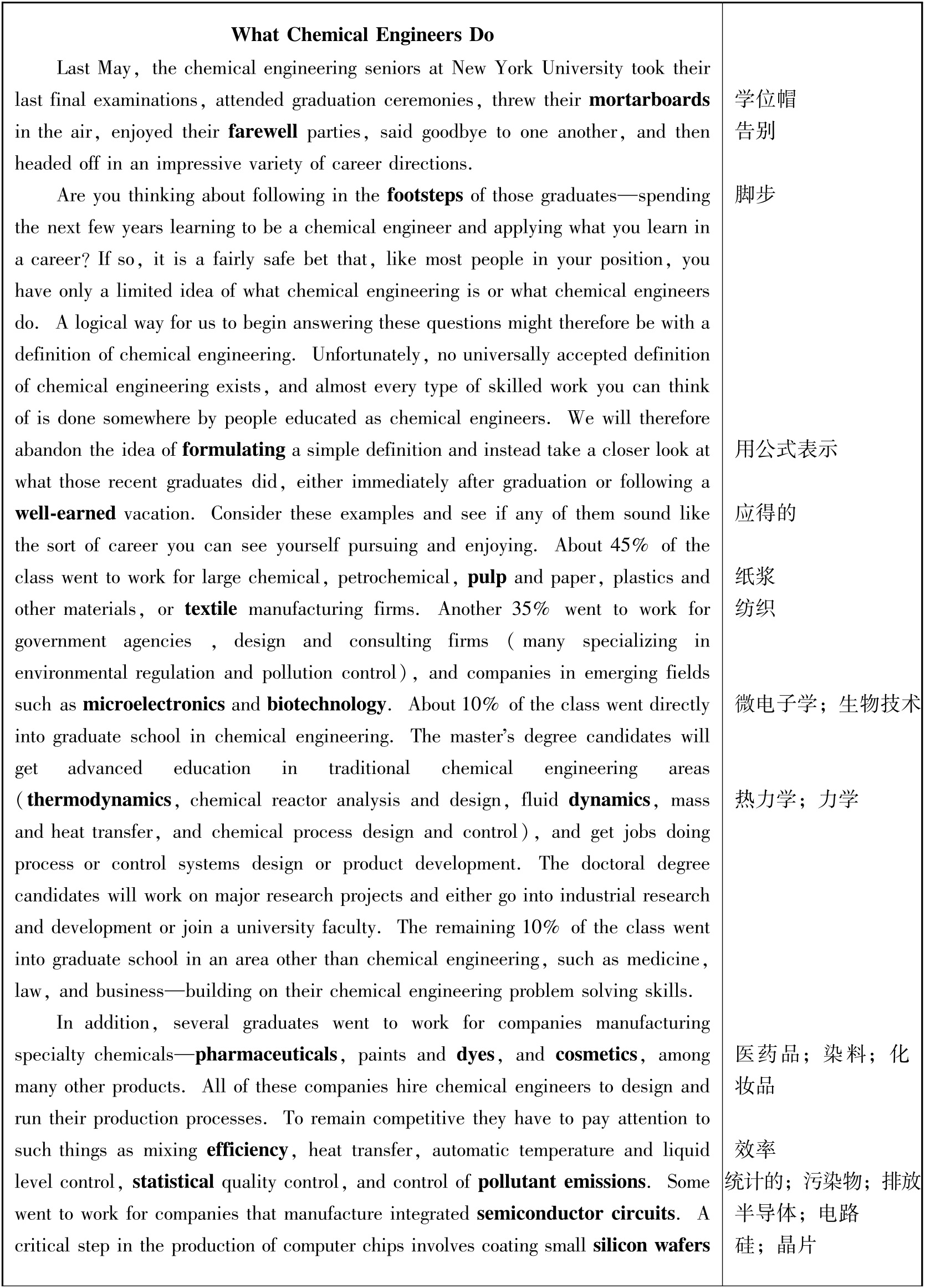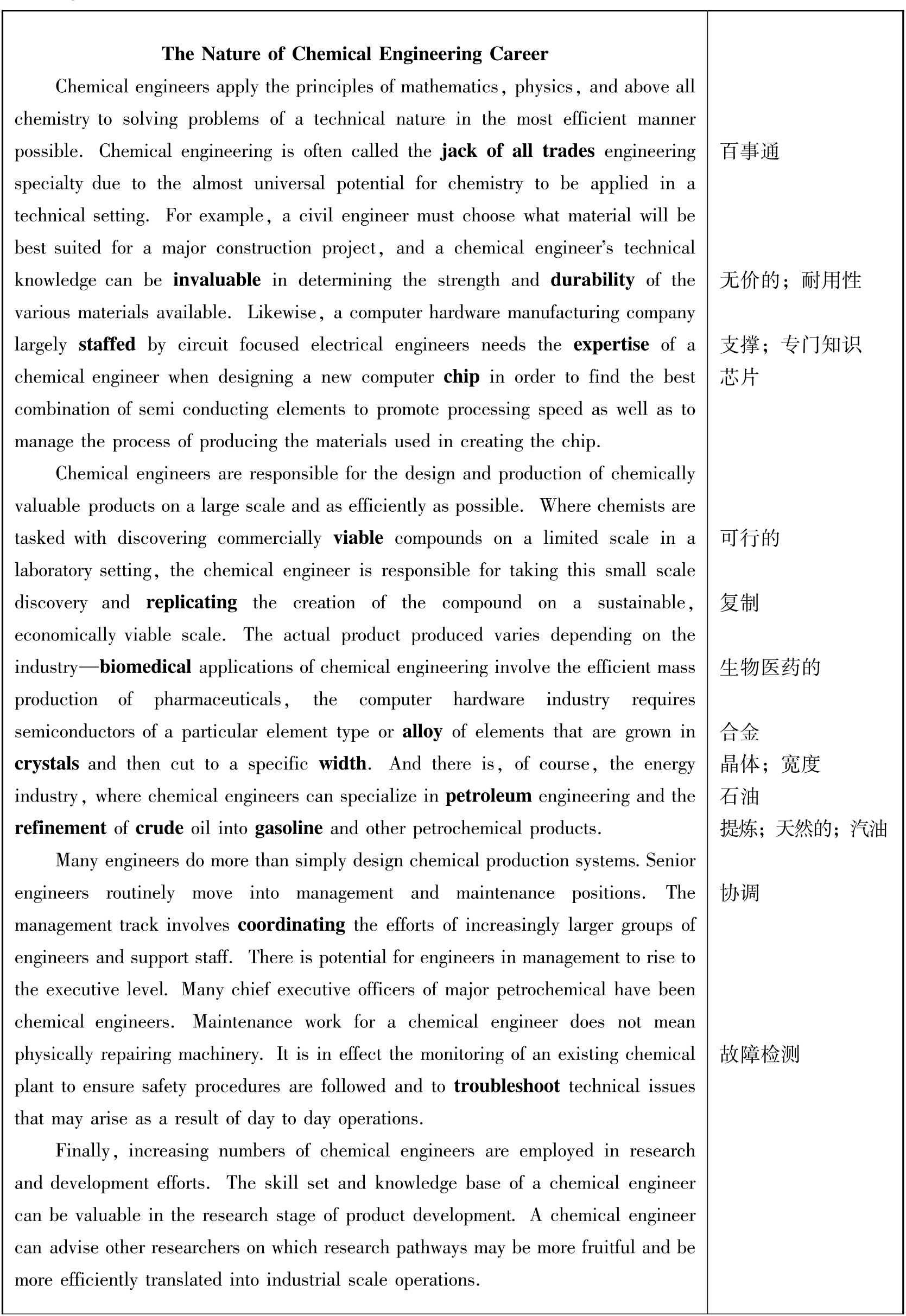 1.Chemical engineering is often called the___________________________(“万金油”工程专业)due to the almost universal potential for chemistry to be applied in a technical setting.