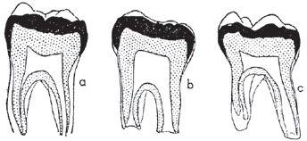左下第一臼齿对比图:a.10岁的中国小孩;b.中国猿人;c.青年黑猩猩。(引自Childrenof the Yellow Earth)