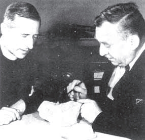 葛兰阶(右)正在研究周口店出土的化石标本,在旁观看者为法国古物学家德日进。(斯德哥尔摩远东古物博物馆提供)