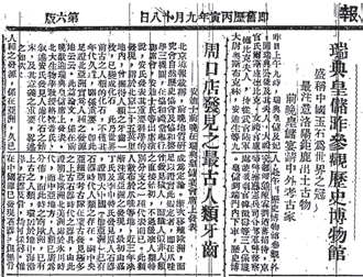安氏发表其重要科学的发现,位于北京二十五英里地内,曾掘得人类之牙齿一枚,已变成化石。此乃世界前古之人类化石,不仅其年代久远,关系重要,即此足证北亚洲实为人种之发源地云云。此篇论文,系在前晚欢迎瑞典皇储席上发表。北大古生物学教授格拉普氏(葛利普),叙述安氏发见人齿化石之始末,及其意义之重要,各述之如次: