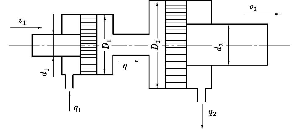 5.如图 2.24 所示为两个液压缸串联。大小活塞分别为D 2 = 125 mm,D 1 = 75 mm;大小活塞杆直径分别为d 2 = 40 mm,d 1 = 20 mm。若流量q = 25 L/ min,求v 1 ,v 2 ,q 1 ,q 2 。