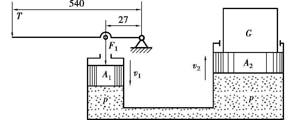 3.在如图 2.23 所示的液压千斤顶中,人施加的力量为T = 3 000 N,大小活塞的面积分别为A 2 = 5 × 10 -3 m 2 ,A 1 = 1 × 10 -3 m 2 ,压力损失不计。试计算: