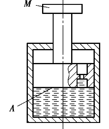在如图 2.27 所示的活塞上有一个小孔,其内径为d,活塞面积为A,其下部的油腔充满了油液,油液的密度为ρ,流量系数为C d ,忽略系统的摩擦力,不考虑泄漏。试分析重物(质量为M)的下降速度。