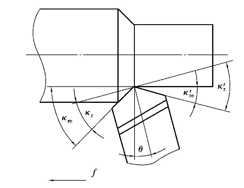 ②刀柄安装偏斜对工作角度的影响。在车削时会出现刀柄与进给方向不垂直的情况,如图2.19所示,此时刀柄垂线与进给方向产生θ角的偏转,将引起工作主偏角和工作副偏角的变化:κ