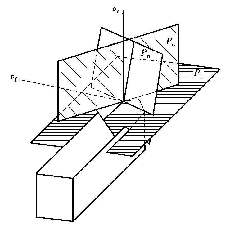 法平面(P n )———过切削刃上选定点垂直于切削刃或其切线的平面。对于切削刃上某一选定点,该点的法平面P n 、基面P r 和切削平面P s 就构成了法平面参考系,如图2.12所示。在法平面参考系中,P s ⊥P r 、P s ⊥P n ,但在刃倾角λ s ≠0的条件下,P n 不垂直于P r .