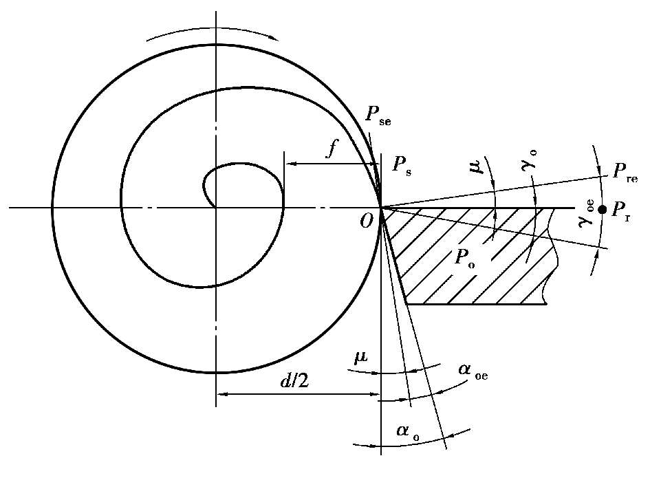 ,运动轨迹是阿基米德螺旋线如图21 6所示这时工作基面Pre和工作切削平面Pse分别相对于基面Pr和切削平面Pe转过μ角。刀具的工作前角γ