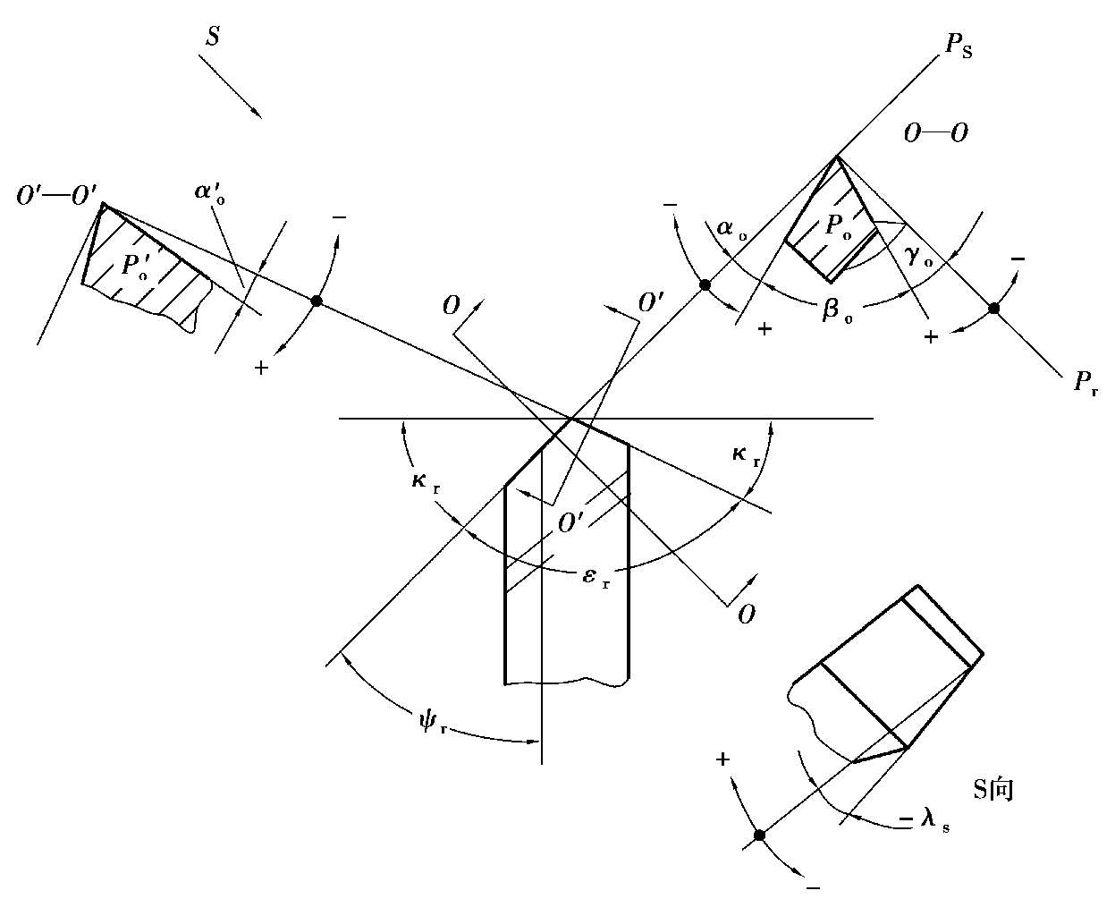 刃倾角λ s ———主切削刃与基面P r 的夹角,在切削平面P s 中测量。当刀尖在主切削刃上为最低点时,λ s 为负值;反之,当刀尖在主切削刃上为最高点时,λ s 为正值。
