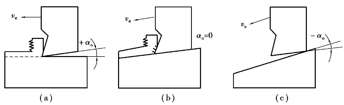 在实际使用时,静止参考系所确定的刀具角度,往往不能确切地反映切削加工的真实情形。只有用合成切削运动方向v e 来确定参考系,才符合切削加工的实际。例如,图2.15所示三把刀具的标注角度完全相同,但由于合成切削运动方向v e 不同,后刀面与加工表面之间的接触和摩擦的实际情形有很大的不同;图2.15(a)刀具后刀面同工件已加工表面之间有适当的间隙,切削情况正常;图2.15(b)中该两个表面全面接触,摩擦严重;图2.15(c)刀具的背棱顶在已加工表面上,切削刃无法切入,切削条件被破坏。可见,在这种场合下,只考虑主运动的假定条件是不合适的,还必须考虑进给运动速度的影响,也就是必须考虑合成切削运动方向来确定刀具工作角度的参考系。