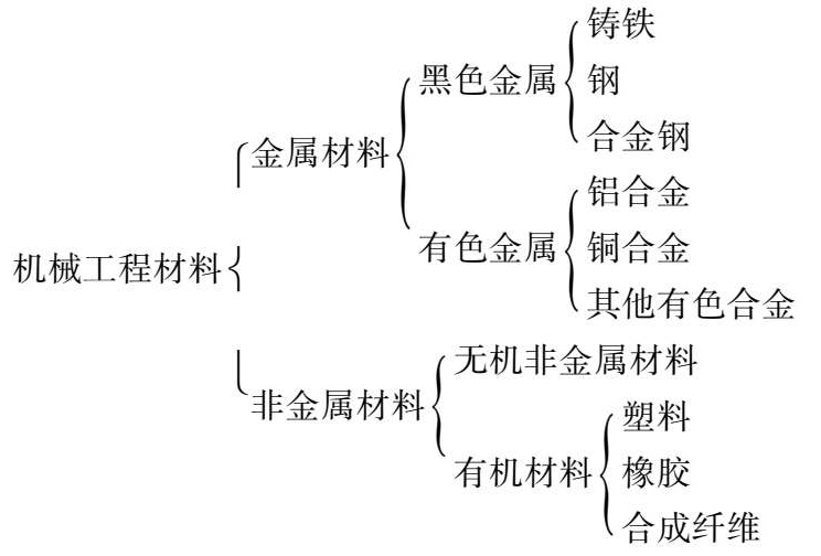机械工程中用到的材料非常广泛,其总体包含两大类,即金属材料和非金属材料。传统制造业里的机械零件或构件多采用金属材料,但由于资源和环境保护因素,以及材料科学的飞速发展,目前非金属材料的应用也极其普遍。机械工程材料的分类如图1.4所示。