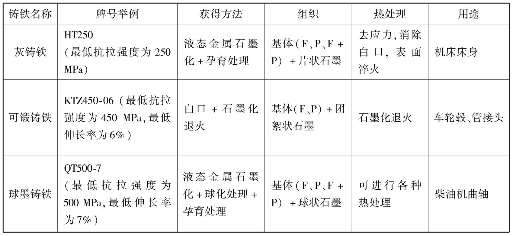 常用铸铁的成分与钢不同,铸铁的含碳量大于2.11%(常用2.5%~ 4.0%),其杂质远大于钢。根据铸铁中碳的存在形式不同,将其分为白口铸铁、灰口铸铁和麻口铸铁。白口铸铁中碳主要以渗碳体的形式存在,灰口铸铁中碳主要以石墨的形式存在,麻口铸铁中的碳以渗碳体和石墨两种形式存在,其中,灰口铸铁应用得最多。