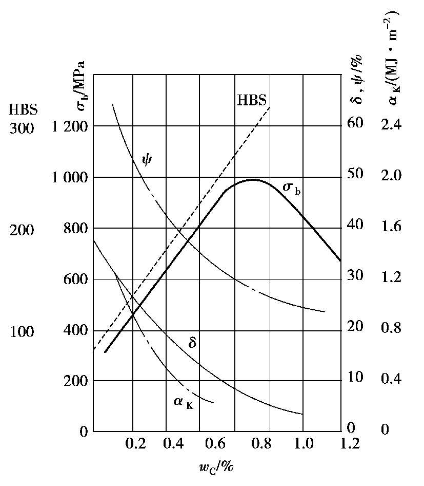 含碳量对钢的性能影响很大。通常随含碳量的增加,钢的抗拉强度及硬度增加而塑性和韧性下降。