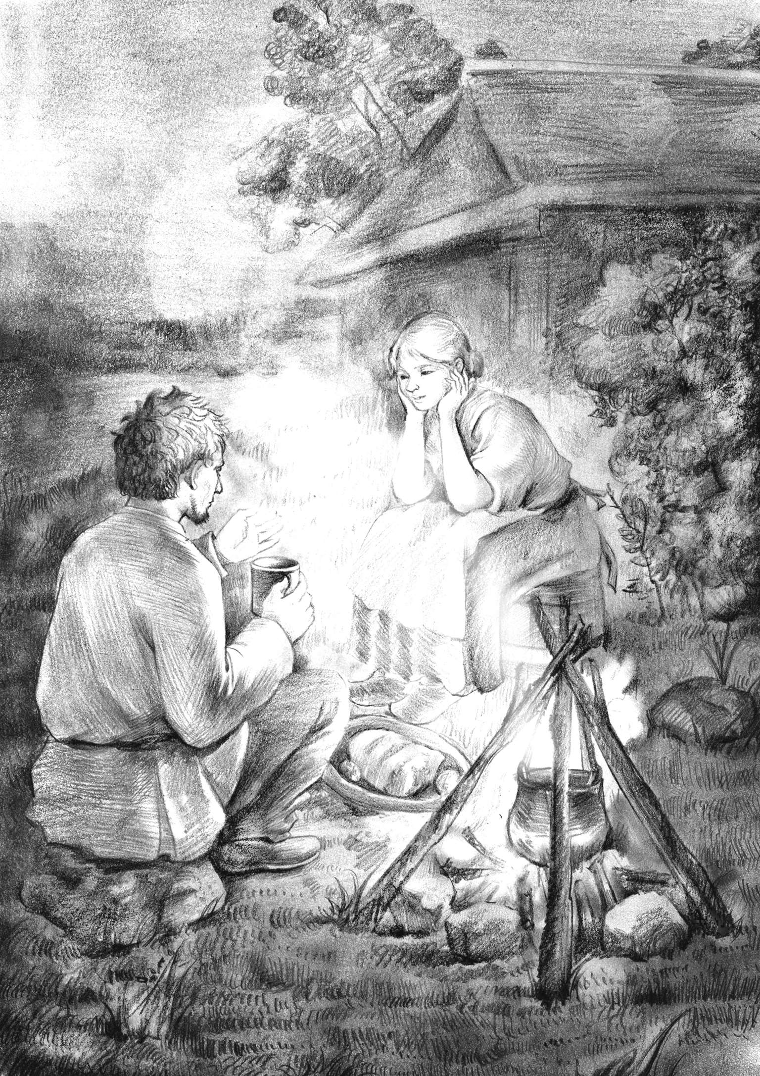叶尔莫莱朝他骂了一通脏话。“咱们到村里去吧,”最后他叹口气说,“但到村子还有两俄里地呢……”“就在这儿过夜吧,”我说,“就睡在外头,夜里还暖和;给点儿钱,让老板给咱们送些麦秸来。”叶尔莫莱顺从地同意了。我们又敲起门来。“你们要干什么呀?”又传来那个雇工的声音,“说过了,不行。”我们向他说明了我们的要求。他去跟老板商量了一会儿,便和老板一起转回来。小门嘎的一声开了。老板露面了,他是个高个子,肥肥的脸,公牛般的后脑勺,滚圆的大肚子。他同意了我们的要求。离磨坊百来步远的地方有一个四面通风的小敞棚。他们把麦秸和干草给我们送到了敞棚里。那雇工在河边草地上摆好茶炊,蹲下身子,尽心地去吹那生火的筒子……炭火闪烁着,清楚地照亮了他那张年轻的脸。磨坊老板跑回去唤醒妻子,终于他自己提出让我们到他房子里过夜;但我们宁愿在外边露宿。老板娘给我们送来了牛奶、鸡蛋、土豆、面包。茶炊很快就烧开了,我们便开始饮茶。河面已是雾气腾腾,没有风,秧鸡在四周咕咕地啼叫,磨坊的水轮边发出微弱的响声,那是轮翼上的水点往下滴,水从堤坝闸门里渗漏出来。我们生起一小堆簧火。叶尔莫莱在灰烬上烤着土豆,我趁机打了一会儿盹儿……一阵压低的轻声细语惊醒了我。我抬头一瞧:那磨坊老板娘正坐在篝火前一个倒放的木桶上同我的猎伴聊天。我早先从她的穿着和举止言谈中已看出她是某地主家的女仆——她不会是农妇,也不会是小市民,不过直到这会儿我才看清她的面容。看样子她有三十来岁,清瘦的面容还留有当年姿色的遗韵,我特别欣赏她那双忧郁的大眼睛。她的两肘支在膝上,手托着脸。叶尔莫莱背对着我坐着,不时地往火堆里添些木柴。