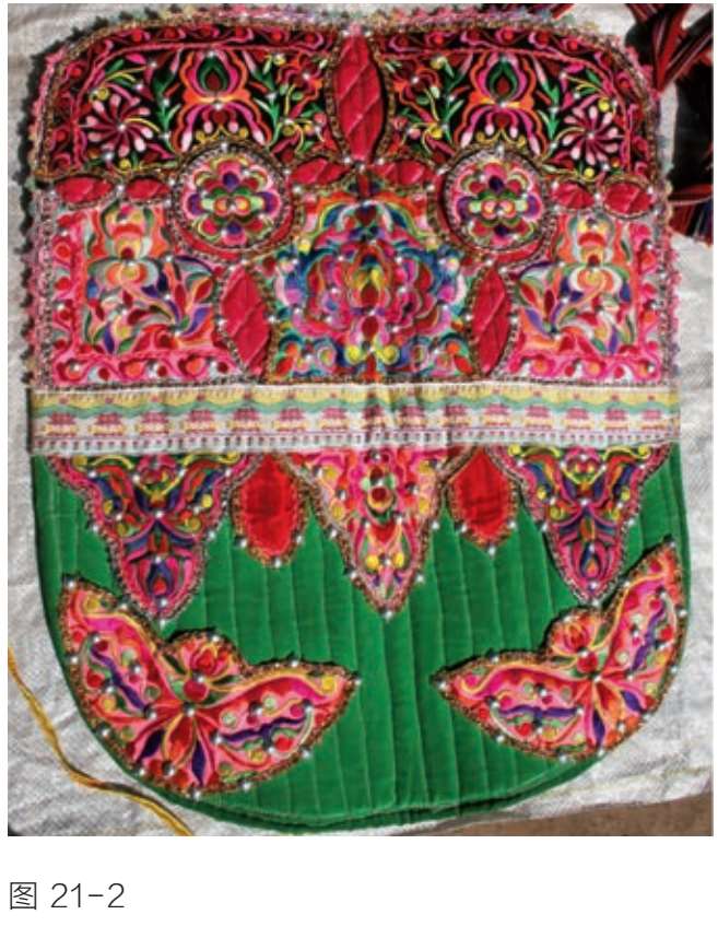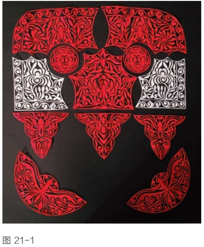 许多民族服饰上的刺绣花样不仅是传统吉祥纹样,有些刺绣剪纸花样中还记述着民族迁徙历史和神话传说等口传文化的内涵。如苗族服饰的刺绣底样剪纸就记录了丰富古老的苗族历史文化信息,其中有苗族图腾祖先——由枫树变成的蝴蝶妈妈,有大洪水过后姜央兄妹合磨成亲、繁衍人类的故事。西南地区的哈尼族、彝族、白族、水族、侗族、布依族、壮族、羌族等民族,都有以剪纸为刺绣底样的传统,也同样有着许多口传文化的内涵。在生活习俗的剪纸花样中,花草纹样是不同民族使用最普遍、纹饰谱系最丰富的纹样,其次是动物纹样,人形纹样使用最少。这些纹样的使用都是用来表达与民俗信仰观念相关的文化内涵,表达对生存吉祥美好的企盼(图 21)。